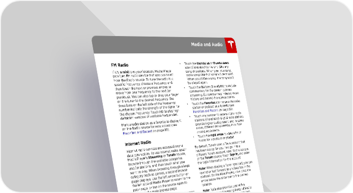Media and Audio • Touch the thumbs up or thumbs down FM Radio icon (if available) to like or dislike any If it's available in your location, Media Player song or podcast. When you like a song, provides FM radio service that you can select more songs like that song will be played. from the Radio source. To tune the radio to a When you dislike a song, the song won't specific frequency, choose a frequency and be played again. then touch the next or previous arrows to • Touch the DJ icon (if available) to include move from one frequency to the next (or commentary for the content you are previous). You can also tap or drag your finger streaming. DJ commentary includes music on the tuner to the desired frequency. The history and behind-the-scenes stories. three bars on the left side of the frequency • Touch the Favorites icon to save the radio number indicate the strength of the signal for station or podcast as a favorite (see the chosen frequency. Touch HD to play high Favorites and Recent on page 89). definition versions of available frequencies. • Touch any number to access digital radio Mark a radio station as a favorite to display it stations (if available). Digital radio stations on the Radio source for easy access (see provide higher quality sound and, in some Favorites and Recent on page 89). cases, different programming than their analog equivalents. Internet Radio • Touch the right arrow to view a list of tracks for a podcast or playlist. Internet radio services are accessed over a By default, TuneIn uses a Tesla account that data connection. To use Internet radio, touch has been set up for you. To sign in to a Media Player's Streaming or TuneIn source, different TuneIn account, scroll to the bottom browse through the available categories of the TuneIn source, touch Sign In, and enter and/or stations, and then touch what you the login information for the account. want to play. When browsing through a large category such as genres, a second browse Note: When playing a TuneIn podcast, you can page displays. Use the left arrow button on rewind or fast forward to any location in the the left side of Media Player to return to the podcast. On the Now Playing view, drag the prior page, or tap on the source again to arrow below the slider bar to the desired return to the main browse page. location. With your Personal Streaming Radio account, Note: Tesla also provides you with a you can create a radio station of your favorite complimentary Streaming Personal Radio songs and songs that are similar to your account for four years. To use your own favorites. When you like a song by touching Slacker Plus or Premium account instead, thumbs up, it is added to your Favorites and is scroll to the bottom of the Streaming source, used to tune your listening profile so that enter your credentials, touch Use High Bitrate similar songs are also added to your Favorites to stream higher quality sound (if your Model station. If you dislike a song by touching 3 is equipped with the optional Ultra High thumbs down, the song is removed from your Fidelity Sound package), and then touch Favorites station. LOGIN. To switch back to your Tesla account, Note: Your Favorites station is linked to your simply touch USE TESLA ACCOUNT; you don't Personal Streaming Radio account for the car. need to enter a user name or password for your Tesla account. You can purchase your To play the next (and in some cases previous) own Slacker Plus or Premium account at available station, episode, or track being www.slacker.com. Model 3 does not support provided by the Internet radio service, touch basic (free) Slacker services. the next (or previous) arrows on the Now Playing view. Favorites and Recent You can also use voice commands (only available when speaking the English language To ensure you always have easy access to your only) to play a specific song, artist, or album favorite stations and audio files, they display from an Internet radio service (see Using at the top of Media Player and on the Now Voice Commands on page 97 ). Playing view. Regardless of which source you When you are listening to internet radio, you are on (Radio, Streaming,TuneIn, Phone, or can do the following on the Now Playing view: USB), you see favorites from all sources. You can maximize or minimize source content simply by swiping. Using the Touchscreen 89