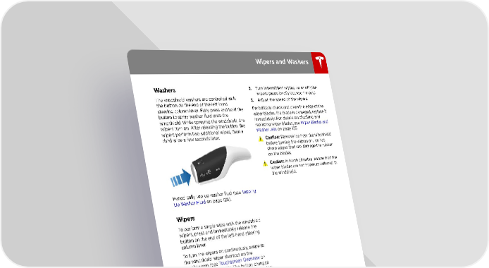 Wipers and Washers Washers 2. Turn intermittent wiping on or off (the wipers pause briefly between wipes). The windshield washers are controlled with 3. Adjust the speed of the wipers. the button on the end of the left-hand steering column lever. Fully press and hold the Periodically check and clean the edge of the button to spray washer fluid onto the wiper blades. If a blade is damaged, replace it windshield. While spraying the windshield, the immediately. For details on checking and wipers turn on. After releasing the button, the replacing wiper blades, see Wiper Blades and wipers perform two additional wipes, then a Washer Jets on page 125. third wipe a few seconds later. Caution: Remove ice from the windshield before turning the wipers on. Ice has sharp edges that can damage the rubber on the blades. Caution: In harsh climates, ensure that the wiper blades are not frozen or adhered to the windshield. Periodically top up washer fluid (see Topping Up Washer Fluid on page 128). Wipers To perform a single wipe with the windshield wipers, press and immediately release the button on the end of the left-hand steering column lever. To turn the wipers on continuously, swipe to the windshield wiper shortcut on the touchscreen (see Touchscreen Overview on page 4), then touch ON. The button changes from gray to blue and the wipers begin wiping continuously. To turn on intermittent wiping (the wipers pause briefly between wipes), touch the button on the bottom of the shortcut window. You can adjust the wiping frequency by touching SLOW or FAST. Note: When you turn the wipers on continuously, the headlights automatically turn on (if they were not already on). 1. Turn wipers on or off. Driving 45