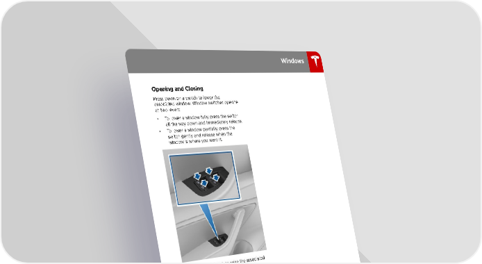 Windows Opening and Closing Press down on a switch to lower the associated window. Window switches operate at two levels: • To lower a window fully, press the switch all the way down and immediately release. • To lower a window partially, press the switch gently and release when the window is where you want it. Similarly, pull a switch to raise the associated window. This also operates at two levels: • To raise a window fully, pull the switch all the way up and immediately release. • To raise a window partially, pull the switch gently and release when the window is where you want it. Warning: Before closing a window, it is the driver†s responsibility to ensure that all occupants, especially children, do not have any body parts extended through the window†s opening. Failure to do so can cause serious injury. Warning: When leaving Model 3, always take your authenticated phone with you. Leaving the authenticated phone in Model 3 can cause unauthorized, unintentional, or hazardous use of Model 3. Opening and Closing 11