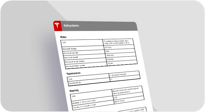 Subsystems Motor Type AC permanent magnet motor, liquid- cooled, with variable frequency drive Nominal Voltage 370 Volts Maximum current 800A Maximum speed 17900 rpm Maximum wheel torque 3700 Nm Maximum motor power 165 kW Transmission Type Single speed fixed gear Gearbox Ratio 9:1 Steering Type Rack and pinion with electronic power steering, speed sensitive Number of turns lock to lock 2.05 Turning Circle (curb to curb) 38.8 ft (11.8 m) Brakes 4-wheel anti-lock braking system (ABS) with Electronic Brake Force Distribution, Type Integrated Advanced Stability Control and Electronic Accelerator pedal actuated regenerative braking system Calipers Front: Four piston fixed Rear: Integrated Electronic Parking Brake Sliding Base Front: 12.6”/320 mm Rotor Diameters (ventilated) Base Rear: 13.2”/335 mm Plus Front: 13.98”/355 mm Plus Rear: 13.2”/335 mm Front Rotor thickness New: 0.98”/25 mm Service limit: 0.91”/23 mm Rear Rotor thickness New: 0.79”/20 mm Service limit: 0.71”/18 mm Front Brake Pad Thickness (excluding back plate) New: 0.393”/10 mm Service limit: 0.110”/2.8 mm 136 Model 3 Owner's Manual