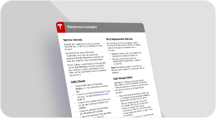 Maintenance Schedule Service Intervals Fluid Replacement Intervals Regular maintenance is the key to ensuring Do not change or top up the Battery coolant the continued reliability and efficiency of your or brake fluid. Tesla service technicians replace Model 3. fluids at the regularly scheduled service Rotate the tires every 6,250 miles intervals: (10,000 km). Maintain the correct tire • Brake fluid. Every 2 years or 25,000 miles pressures. It is also important to perform the (40,000 km), whichever comes first. daily and monthly checks described below. • Battery coolant. Every 4 years or Model 3 should be serviced by Tesla-certified 50,000 miles (80,000 km), whichever technicians. Damages or failures caused by comes first. maintenance or repairs performed by non- Note: Any damage caused by opening the Tesla certified technicians are not covered by Battery coolant reservoir is excluded from the the warranty. warranty. Daily Checks High Voltage Safety • Check the Battery†s charge level, Your Model 3 has been designed and built displayed on the touchscreen or mobile with safety as a priority. However, be aware of app. these precautions to protect yourself from the • Check the condition and pressure of each risk of injury inherent in all high-voltage tire (see Tire Care and Maintenance on systems: page 113). • Read and follow all instructions provided • Check that all exterior lights, horn, turn on the labels that are attached to Model 3. signals, and wipers and washers are These labels are there for your safety. working. • The high voltage system has no user- • Check the operation of the brakes, serviceable parts. Do not disassemble, including the parking brake. remove or replace high voltage • Check the operation of the seat belts components, cables or connectors. High (see Seat Belts on page 21). voltage cables are colored orange for easy • Look for abnormal fluid deposits identification. underneath Model 3 that might indicate a • If a collision occurs, do not touch any high leak. It is normal for a small pool of water voltage wiring, connectors, or to form (caused by the air conditioning components connected to the wiring. system†s dehumidifying process). • In the unlikely event that a fire occurs, immediately contact your local fire Monthly Checks emergency responders. • Check the mileage to determine if the Warning: Always disconnect the charge tires need to be rotated (every 6,250 miles cable before working underneath Model (10,000 km)), and check the condition 3, even if charging is not in progress. and pressure of each tire (see Tire Care Warning: Keep your hands and clothing and Maintenance on page 113). away from cooling fans. Some fans • Check windshield washer fluid level and operate even when Model 3 is powered top up if necessary (see Topping Up off. Washer Fluid on page 128). Warning: Some fluids (battery acid, • Check that the air conditioning system is Battery coolant, brake fluid, windshield operating correctly (see Climate Controls washer additives, etc.) used in vehicles on page 84). are poisonous and should not be inhaled, Warning: Contact Tesla immediately if swallowed, or brought into contact with you notice any significant or sudden drop open wounds. For your safety, always in fluid levels or uneven tire wear. read and follow instructions printed on fluid containers. 112 Model 3 Owner's Manual