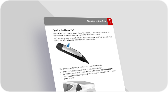 Charging Instructions Opening the Charge Port The charge port is located on the left side of Model 3, behind a door that is part of the rear tail light assembly. Park so that the charge cable easily reaches the charge port. With Model 3 unlocked (or an authenticated phone is within range) and in Park, press and release the button on the Tesla charge cable to open the charge port door. You can also open the charge port door using any of these methods: • On the touchscreen's image of Model 3, touch the charging icon. • On the touchscreen, touch the charging icon, and then press OPEN CHARGE PORT. • Press the bottom of the charge port door when Model 3 is unlocked or an authenticated phone is nearby. Note: The Tesla "T" lights up white when you open the charge port door. If you do not insert a charge cable into the charge port within a few minutes after opening the charge port door, the charge port door closes. If this happens, use the touchscreen to open the charge port door again Caution: Do not try to force the charge port door open. Charging 107