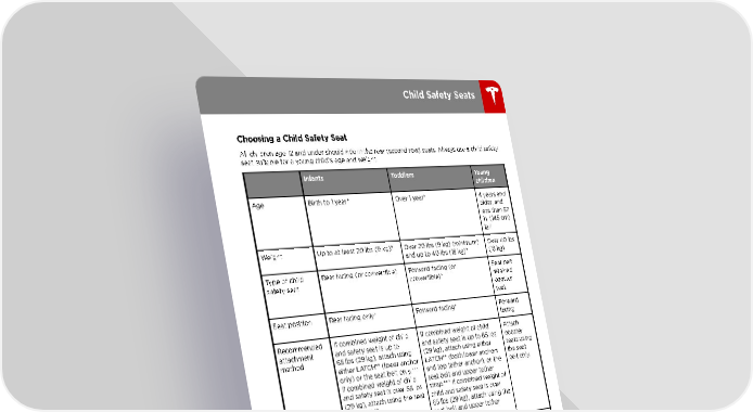 Child Safety Seats Choosing a Child Safety Seat All children age 12 and under should ride in the rear (second row) seats. Always use a child safety seat suitable for a young child†s age and weight. Infants Toddlers Young children Age Birth to 1 year* Over 1 year* 4 years and older, and less than 57 in. (145 cm) tall Weight Up to at least 20 lbs (9 kg)* Over 20 lbs (9 kg) (minimum) Over 40 lbs and up to 40 lbs (18 kg)* (18 kg) Type of child Rear facing (or convertible) Forward facing (or Seat belt safety seat convertible)* retained booster seat Seat position Rear facing only* Forward facing* Forward facing Recommended If combined weight of child If combined weight of child Attach attachment and safety seat is up to and safety seat is up to 65 lbs booster method 65 lbs (29 kg), attach using (29 kg), attach using either seats using either LATCH** (lower anchor LATCH** (both lower anchors the seat only) or the seat belt only.*** and top tether anchor), or the belt only. If combined weight of child seat belt and upper tether and safety seat is over 65 lbs strap.*** If combined weight of (29 kg), attach using the seat child and safety seat is over belt only.*** 65 lbs (29 kg), attach using the seat belt and upper tether strap.*** * Many child safety seats currently available allow children to ride rear-facing using the child safety seat†s integrated 5-point harness for a longer period of time BASED UPON SPECIFIC HEIGHT AND WEIGHT LIMITS. Keep your child in a rear facing seat for as long as possible. CHECK THE CHILD SAFETY SEAT MANUFACTURER†S INSTRUCTIONS AND CAREFULLY FOLLOW ALL INSTRUCTIONS ** LATCH - Lower Anchors and Tethers for Children. In Canada, this is also called Lower Universal Anchorage System (LUAS), or CANFIX. *** Subject to instructions provided by the child safety seat manufacturer. Warning: Laws that govern how and where children should be carried when traveling in a vehicle are subject to change. It is the driver†s responsibility to keep up to date on, and comply with, all current regulations in the region(s) where Model 3 is driven. To check the child passenger safety laws for states in the U.S., go to: http://www.ghsa.org/html/stateinfo/ laws/childsafety_laws.html. Seating and Safety Restraints 25