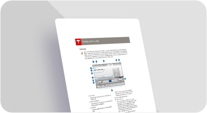 book.book Page 12 Friday, July 19, 2013 12:53 PM Media and Audio Media and Audio Media and Audio Overview Touch the Media icon to listen to the radio or play audio files. The touchscreen displays the Media Player. Use the Browse tab to select what you want to play and use the Now Playing tab to view and control what is currently playing. You can play AM, FM radio, and DAB radio (if Model S is equipped with the optional sound package). You can also play Internet radio, and audio files from a connected Bluetooth or USB device. 1. Favorites NOTE: If an empty preset is available Display the list of your favorite stations or (see item 14), adding a station to your media files. Favorites also assigns it to a preset. 2. Recently Played 8. Signal Strength Indicator Display the list of stations or music files you 9. DAB Controls have recently listened to. When listening to a DAB radio channel, 3. Browse touching the service name displays a popup Display media sources or browse audio that allows you to choose from a list of files. services that are available within the 4. Audio Settings currently selected DAB channel. Or touch the left (back) and right (forward) arrows to 5. Source Picker scroll through the service list. Choose a different media source. 10. Station Frequency/Channel Selector 6. Station Information Drag the selector bar left or right to Depending on the frequency being manually select a channel. received, information about the currently 11. Seek Previous selected station or radio service may be 12. Seek Next displayed. 13. Presets 7. Add/Delete Favorite Touch and hold to assign the currently Add the currently playing station to your playing radio station to the associated Favorites list. A blue icon indicates the preset. When assigned, the preset displays station has already been added and the station or channel name. You can store touching it again removes it. up to six presets for each radio source. 5.12 MODEL S OWNERS MANUAL