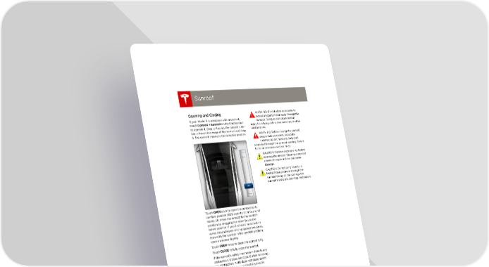 book.book Page 12 Friday, July 19, 2013 12:53 PM Sunroof Sunroof Sunroof WARNING: Do not allow occupants to Opening and Closing If your Model S is equipped with a sunroof, extend any part of their body through the touch Controls > Sunroof on the touchscreen sunroof. Doing so can cause serious to operate it. Drag, or tap on, the sunroof slider injury from flying debris, tree branches, or other bar, or touch the image of the sunroof and drag obstructions. it. The sunroof moves to the selected position. WARNING: Before closing the sunroof, ensure that occupants, especially children, do not have any body part extended through the sunroof opening. Failure to do so can cause serious injury. CAUTION: Remove snow and ice before opening the sunroof. Opening a sunroof covered in snow and ice can cause damage. CAUTION: Do not carry objects in ModelS that protrude through the sunroof. Doing so can damage the sunroof’s seals and anti-trap mechanism. Touch OPEN once to open the sunroof to its comfort position (80% open to minimize wind noise). Or, move the sunroof to the comfort position by dragging the slider bar to the indent position. If you find wind noise (which varies depending on driving speed) excessive, even with the sunroof in the comfort position, open a window slightly. Touch OPEN twice to open the sunroof fully. Touch CLOSE to fully close the sunroof. If the sunroof’s safety mechanism detects any obstruction, it does not close. If, after removing the obstruction, it still does not close, touch and hold CLOSE to override the sunroof’s anti-trap mechanism. Touch VENT to open the sunroof slightly. To stop the sunroof from moving at any time, touch the image of the sunroof. 2.12 MODEL S OWNERS MANUAL