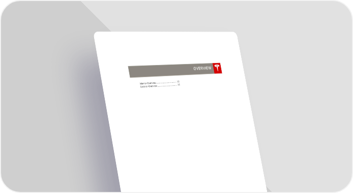 Tesla Model S | Owner's Manual Page 4 Page 6book.book Page 1 Friday, July 19, 2013 12:53 PM OVERVIEW Interior Overview............................................... 1.2 Exterior Overview............................................. 1.3 1.1