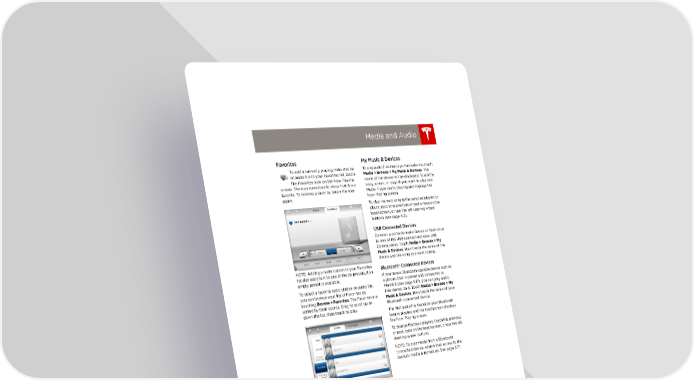 book.book Page 15 Friday, July 19, 2013 12:53 PM Media and Audio Favorites My Music & Devices To add a currently playing radio station To play audio files from a portable device, touch or audio file to your Favorites list, touch Media > Browse > My Music & Devices. The the Favorites icon on the Now Playing name of the device will be displayed. Touch the screen. The icon turns blue to show that it is a song, album, or playlist you want to play and favorite. To remove a favorite, touch the icon Media Player starts playing and displays the again. Now Playing screen. To play the next song in the selected playlist or album, touch the previous or next arrows on the touchscreen, or use the left steering wheel buttons (see page 4.3). USB Connected Devices Connect a portable audio device or flash drive to one of the USB connections (see USB Connections). Touch Media > Browse > My Music & Devices, then touch the name of the device and the song you want to play. NOTE: Adding a radio station to your Favorites Bluetooth® Connected Devices list also assigns it to one of the six presets, if an If you have a Bluetooth-capable device such as empty preset is available. a phone, that is paired and connected to To select a favorite radio station or audio file, ModelS (see page 5.17), you can play audio you can browse your list of Favorites by files stored on it. Touch Media > Browse > My touching Browse > Favorites. The Favorites are Music & Devices, then touch the name of your sorted by their source. Drag to scroll up or Bluetooth connected device. down the list, then touch to play. The first audio file found on your Bluetooth begins playing and the touchscreen displays the Now Playing screen. To change the track playing, touch the previous or next icons on the touchscreen, or use the left steering wheel buttons. NOTE: To play media from a Bluetooth connected device, ensure that access to the device’s media is turned on. See page 5.17. You can also scroll through your Favorites list using the left steering wheel buttons (see page4.3), To remove a favorite from the list, touch the associated X. NOTE: If you remove a favorite radio station or channel that is assigned to a preset, it is also removed from the preset. USING THE TOUCHSCREEN 5.15