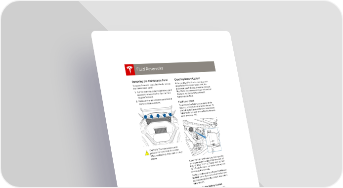 book.book Page 16 Friday, July 19, 2013 12:53 PM Fluid Reservoirs Fluid Reservoirs Fluid Reservoirs Removing the Maintenance Panel Checking Battery Coolant To access fuses and check fluid levels, remove If the quantity of fluid in the cooling system the maintenance panel: drops below the recommended level, the 1. Pull the rear edge of the maintenance panel instrument panel displays a warning message. upward to release the five clips that hold Stop Model S as soon as safety permits and call the panel in place. Roadside Assistance to have Model S 2. Maneuver the maintenance panel toward transported to Tesla. the windshield to remove. Fluid Level Check Tesla checks the Battery coolant level at the regularly scheduled maintenance intervals. To check it yourself, park Model S on level ground. When ModelS is cool, remove the maintenance panel (see page 7.16). CAUTION: The maintenance panel protects the front trunk from water. When re-attaching, make sure it is fully seated. Check the fluid level visually by looking at the outside marks on the side of the reservoir. DO NOT REMOVE THE FILLER CAP AND DO NOT ADD FLUID. Doing so can result in damage not covered by the warranty. The fluid level should be between the MIN and the MAX marks. If you notice that the fluid level has dropped significantly, contact Tesla before using Model S. Topping Up the Battery Coolant Under no circumstances should you add coolant. If the instrument panel warns you that the fluid level is low, contact Tesla immediately. To maximize the performance and life of the Battery, the cooling system uses a specific type of G-48 ethylene-glycol coolant (HOAT). Contact Tesla for more specific information about the coolant. 7.16 MODEL S OWNERS MANUAL