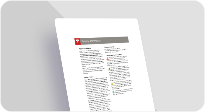charging.fm Page 4 Monday, July 22, 2013 11:52 AM Battery Information Battery Information Battery Information Temperature Limits About the Battery ModelS has one of the most sophisticated Do not expose Model S to ambient battery systems in the world. The most temperatures above 60° C or below -30° C for important way to preserve the Battery is to more than 24 hours at a time. LEAVE YOUR MODELS PLUGGED IN when you Battery Warnings and Cautions are not using it. This is particularly important if you are not planning to drive Model S for WARNING: The Battery has no parts that several weeks. When plugged in, Model S wakes an owner or a non-Tesla authorized up when needed to automatically maintain a service technician can service. Under no charge level that maximizes the lifetime of the circumstances should you open or tamper with Battery. the Battery. Always contact Tesla to arrange for There is no advantage to waiting until the Battery servicing. Battery’s level is low before charging. In fact, CAUTION: If the Battery’s charge level the Battery performs best when charged falls to 0%, you must plug it in. If you leave regularly. it unplugged for an extended period, it may not be possible to charge Model S or use the Battery Care vehicle without jump starting or replacing the 12V battery. Leaving Model S unplugged for an Never allow the Battery to fully discharge. Even extended period can also result in permanent when Model S is not being driven, its Battery Battery damage. If you are unable to charge discharges very slowly to power the onboard Model S, contact Tesla immediately. electronics. On average, the Battery discharges CAUTION: The Battery requires no owner at a rate of 1% per day. Situations can arise in maintenance. Do not remove the filler cap which you must leave Model S unplugged for an and do not add fluid. If the instrument panel extended period of time (for example, at an warns you that the fluid level is low, contact airport when traveling). In these situations, Tesla immediately. keep the 1% in mind to ensure that you leave the Battery with a sufficient charge level. For At the end of its service life, the Battery example, over a two week period (14 days), the should be recycled. Contact Tesla for Battery discharges by approximately 14%. recycling arrangements. Discharging the Battery to 0% may permanently damage the Battery. To protect against a complete discharge, Model S enters a low-power consumption mode when the charge level drops to 5%. In this mode, the Battery stops supporting the onboard electronics to slow the discharge rate to approximately 4% per month. Once this low-power consumption mode is active, it is important to plug in Model S within two months to avoid Battery damage. NOTE: When the low-power consumption mode is active, the auxiliary 12V battery is no longer being charged and can completely discharge within 12 hours. In the unlikely event that this occurs, you may need to jump start or replace the 12V battery before you can charge. In this situation, contact Tesla. 6.4 MODEL S OWNERS MANUAL
