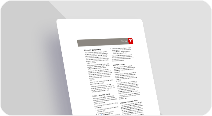 book.book Page 17 Friday, July 19, 2013 12:53 PM Phone Phone 6. Check that the number displayed on your Bluetooth® Compatibility You can use your Bluetooth-capable phone phone matches the number displayed on hands-free in Model S provided your phone is the touchscreen. Then, on your phone, within operating range. Although Bluetooth confirm that you want to pair. typically supports wireless communication When paired, Model S connects to the phone over distances of up to approximately 9 metres, and the touchscreen displays the Bluetooth performance can vary based on the phone’s symbol next to the phone’s name to show that software and age. the connection is active. Before using your phone with Model S, you must pair it. Pairing sets up Model S to work Importing Contacts with your Bluetooth-capable phone. Once paired, you can use the Bluetooth You can pair up to ten Bluetooth phones. settings screen to specify whether you want to ModelS always automatically connects to the allow access to your phone’s contacts and last phone that was used (provided it is within recent calls. range). If you want to connect to a different If access is turned on, you can see your list of phone, see Connecting to a Paired Phone, contacts on the Model S touchscreen. Touch page5.18. Phone > Contacts. You can then touch a NOTE: On many phones, Bluetooth turns off if contact to dial its phone number or navigate to the phone’s battery is low. its address. In addition to phones, you can also pair NOTE: Before contacts can be imported, you Bluetooth-enabled devices with Model S. For may need to either set your phone to allow example, you can pair an iPod Touch or an iPad syncing, or respond to a popup on your phone or Android tablet to stream music. to confirm that it is OK to sync contacts. This varies depending on the type of phone you are Pairing a Bluetooth Phone using. For details, refer to the owner documentation provided with your phone. Pairing sets up Model S to work with your If access is turned on, imported information is Bluetooth-capable phone. Once a phone is displayed when you touch the contacts tab on paired, Model S can connect to it whenever the the Phone app. phone is within range. To pair a phone, follow these steps while sitting Unpairing a Bluetooth Phone inside Model S: 1. Ensure both the touchscreen and the phone If you want to disconnect your phone and use it are powered on. again later, simply touch Disconnect on the 2. On the touchscreen’s status bar, Bluetooth settings screen. If you do not want to touch (the Bluetooth icon). use your phone with Model S again, touch Forget This Device. Once you forget a device, 3. On your phone, enable Bluetooth and set it you need to pair it again if you want to use it to discoverable. with Model S (see Pairing a Bluetooth phone). 4. On the Model S touchscreen, touch Start NOTE: Your phone automatically disconnects Search. The touchscreen searches then whenever you leave Model S. displays the list of all available Bluetooth devices within operating distance. 5. On the Model S touchscreen, touch the phone with which you want to pair. Within a few seconds, the touchscreen displays a randomly generated number, and your phone should display the same number. USING THE TOUCHSCREEN 5.17
