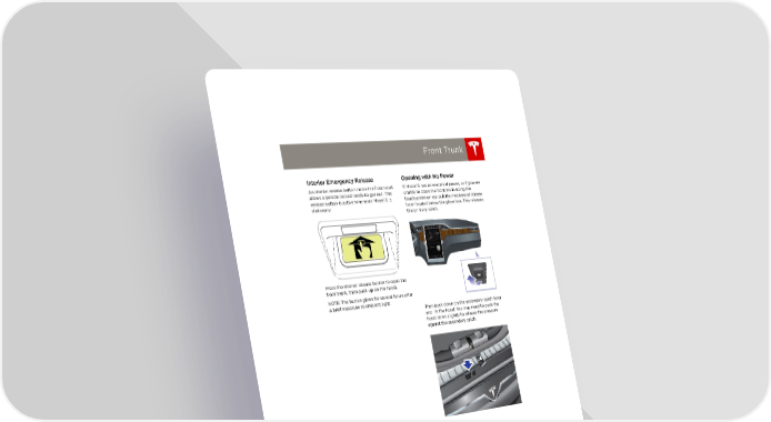 book.book Page 11 Friday, July 19, 2013 12:53 PM Front Trunk Interior Emergency Release Opening with No Power An interior release button inside the front trunk If Model S has no electrical power, or if you are allows a person locked inside to get out. This unable to open the front trunk using the release button is active whenever Model S is touchscreen or key, pull the mechanical release stationary. lever located below the glove box. This releases the primary catch. Press the interior release button to open the front trunk, then push up on the hood. NOTE: The button glows for several hours after a brief exposure to ambient light. Then push down on the secondary catch lever and lift the hood. You may need to push the hood down slightly to release the pressure against the secondary catch. OPENING AND CLOSING 2.11
