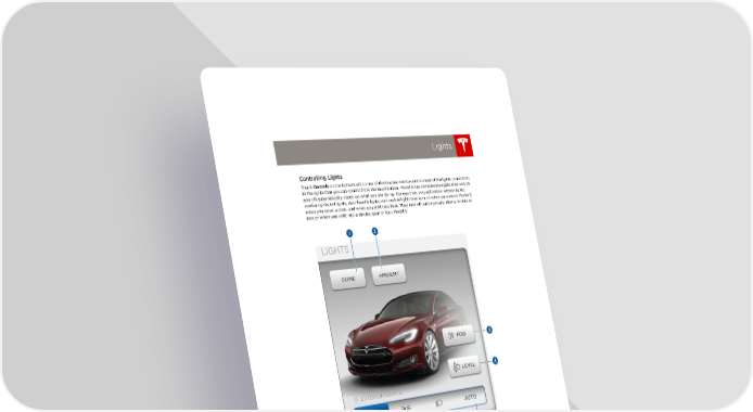 book.book Page 11 Friday, July 19, 2013 12:53 PM Lights Lights Controlling Lights Touch Controls on the bottom left corner of the touchscreen to control most of the lights. In addition to the lights that you can control from the touchscreen, Model S has convenience lights that turn on and off automatically based on what you are doing. For example, you will notice interior lights, marker lights, tail lights, door handle lights, and puddle lights that turn on when you unlock Model S, when you open a door, and when you shift into Park. They turn off automatically after a minute or two or when you shift into a driving gear or lock Model S. DRIVING 4.11