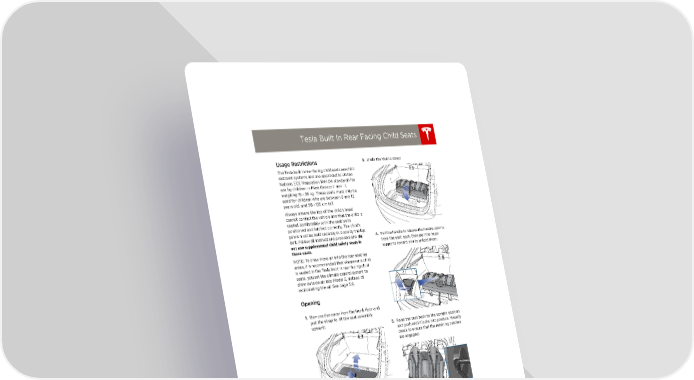 book.book Page 11 Friday, July 19, 2013 12:53 PM Tesla Built In Rear Facing Child Seats Tesla Built In Rear Facing Child Seats 3. Undo the Velcro strap: Usage Restrictions The Tesla built in rear facing child seats are child restraint systems and are approved to United Nations ECE Regulation R44.04 standards for use by children in Mass Groups II and III, weighing 15 - 36 kg. These seats must only be used for children who are between 3 and 12 years old, and 98 - 135 cm tall. Always ensure the top of the child’s head cannot contact the vehicle and that the child is seated comfortably with the seat belts positioned and latched correctly. The child’s pelvis must be held securely in place by the lap belt. Follow all instructions provided and do 4. Pull the handle to release the head supports not use supplemental child safety seats in from the seat back, then pull the head these seats. supports toward you to unfold them: NOTE: To draw more air into the rear seating areas, it is recommended that whenever a child is seated in the Tesla built in rear facing child seats, you set the climate control system to draw outside air into Model S, instead of recirculating the air. See page 5.9. Opening 1. Remove the cover from the trunk floor and pull the strap to lift the seat assembly upward: 5. Raise the seat back to the upright position and push until it locks into position. Visually check to ensure that the retaining catches are engaged: 2. Push the seat assembly into position: 6. Check that the seat back and seat base are securely retained in the upright position by trying to pull the seat back toward you. SEATING AND SAFETY RESTRAINTS 3.11