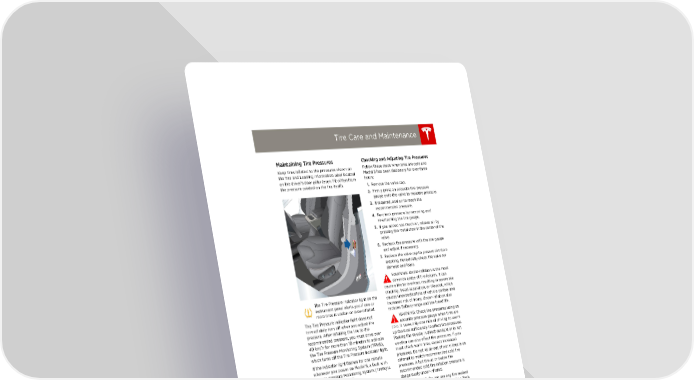 book.book Page 3 Friday, July 19, 2013 12:53 PM Tire Care and Maintenance Tire Care and Maintenance Checking and Adjusting Tire Pressures Maintaining Tire Pressures Keep tires inflated to the pressures shown on Follow these steps when tires are cold and the Tire and Loading Information label located Model S has been stationary for over three on the driver’s door pillar (even if it differs from hours: the pressure printed on the tire itself). 1. Remove the valve cap. 2. Firmly press an accurate tire pressure gauge onto the valve to measure pressure. 3. If required, add air to reach the recommended pressure. 4. Re-check pressure by removing and re-attaching the tire gauge. 5. If you added too much air, release air by pressing the metal stem in the center of the valve. 6. Recheck the pressure with the tire gauge and adjust if necessary. 7. Replace the valve cap to prevent dirt from entering. Periodically check the valve for damage and leaks. WARNING: Under-inflation is the most common cause of tire failures. It can cause a tire to overheat, resulting in severe tire cracking, tread separation, or blowout, which The Tire Pressure indicator light on the causes unexpected loss of vehicle control and instrument panel alerts you if one or increased risk of injury. Under-inflation also more tires is under- or over-inflated. reduces Battery range and tire tread life. The Tire Pressure indicator light does not WARNING: Check tire pressures using an immediately turn off when you adjust tire accurate pressure gauge when tires are pressure. After inflating the tire to the cold. It takes only one mile of driving to warm recommended pressure, you must drive over up the tires sufficiently to affect tire pressures. 40 km/h for more than 10 minutes to activate Parking the vehicle in direct sunlight or in hot the Tire Pressure Monitoring System (TPMS), weather can also affect tire pressures. If you which turns off the Tire Pressure indicator light. must check warm tires, expect increased If the indicator light flashes for one minute pressures. Do not let air out of warm tires in an whenever you power on Model S, a fault with attempt to match recommended cold tire the Tire Pressure Monitoring System (TPMS) is pressures. A hot tire at or below the detected (see page 7.6). recommended cold tire inflation pressure is dangerously under-inflated. WARNING: Do not use any tire sealant other than the type provided in a Tesla tire repair kit. Other types can cause tire pressure sensors to malfunction. If your ModelS did not include a tire repair kit, you can purchase one from Tesla Motors. MAINTENANCE 7.3