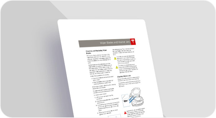 book.book Page 15 Friday, July 19, 2013 12:53 PM Wiper Blades and Washer Jets Wiper Blades and Washer Jets non-detergent soap. Then, rinse the windshield Checking and Replacing Wiper Blades and wiper blades with clean water. The Periodically check and clean the edge of the windshield is clean when water beads do not wiper blade and check the rubber for cracks, form. splits and roughness. If damaged, replace the CAUTION: Only use cleaning products blade immediately to prevent damage to the approved for use on automotive glass glass. and rubber. Inappropriate products can Contaminants on the windshield, or on the cause damage or smears, and create wiper blades, can reduce the effectiveness of glare on the windshield. the wiper blades. Contaminants include ice, CAUTION: Only install replacement wax spray from car washes, washer fluid with blades that are identical to the original bug and/or water repellent, bird droppings, blades. Using inappropriate blades can tree sap, and other organic substances. damage the wiper system and affect the Follow these guidelines for cleaning: operation of the rain sensor. • Clean the windshield using non-abrasive Cleaning Washer Jets glass cleaner. • Wipe the blades clean using isopropyl The position of the windshield washers is set at (rubbing) alcohol or washer fluid. the factory and should never need adjusting. If the wipers remain ineffective after cleaning, If a windshield washer becomes blocked, use a replace the wiper blades. thin strand of wire to clear any blockages from the nozzle. For optimum performance, wiper blades should be replaced at least once a year. To replace wiper blades: 1. Lift the wiper arm away from the windshield. 2. Press the locking tab while sliding the blade down the arm. 3. To install the new blade, align the new blade on the wiper arm and slide it toward the hooked end of the arm until it locks into place. 4. Place the wiper arms with the blades against the windshield. WARNING: Do not operate the washers while cleaning Model S. Windshield washer fluid can irritate eyes and skin. Read and observe the washer fluid manufacturer’s instructions. If the problem persists with new blades, clean the windshield and wiper blades using a soft cloth or sponge and warm water with MAINTENANCE 7.15