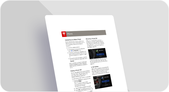 book.book Page 18 Friday, July 19, 2013 12:53 PM Phone Phone Connecting to a Paired Phone Receiving a Phone Call ModelS automatically connects with the last When your connected phone receives an phone to which it was connected, provided it is incoming call, both the instrument panel and within operating range and has Bluetooth the touchscreen display the caller’s number or turned on. name (if the caller is in your phone’s contact list To connect to a different phone: and Model S has access to your contacts, as 1. On the Model S touchscreen’s status bar, described on page 5.17). touch (the Bluetooth icon). 2. The Model S touchscreen displays the list of paired phones. If the phone is not on the list, follow the instructions on page 5.17 to pair it. 3. Choose the phone you want to connect to from the list of paired phones, then touch Connect. Touch one of the options on the touchscreen, or When connected, the Model S touchscreen use the scroll wheel on the right side of the displays the Bluetooth symbol next to the steering wheel to Answer or Ignore the call (see phone name to show that the connection is page4.4). active. Making a Phone Call In Call Options When a call is in progress, you can display the You can make a phone call by using the Model S call menu on the instrument panel by pressing on-screen dialer, or by choosing a contact from the top button on the right side of the steering your contact list, and then touching the wheel. Then use the scroll wheel to scroll contact’s number you want to call. through and choose an option (see page 4.4). To make a phone call using the on-screen dialer: 1. Touch the Phone app on the touchscreen, then touch Dialer. NOTE: If a phone is not currently connected, the touchscreen displays the Connect Phone message. 2. Enter the phone number on the dialer. 3. Touch Call. The touchscreen displays the call screen and the number you are calling. To make a phone call by choosing a contact: 1. Touch the Phone app on the touchscreen, then touch Contacts. NOTE: Ensure that access to the phone’s contacts is turned on. See page 5.17. 2. Touch the name of the contact you want to call to display details about the contact. 3. Touch the number you want to dial (there may be more than one). The touchscreen displays the call screen and the name of the contact you are calling. NOTE: If it is safe and legal to do so, you can also initiate a call by dialing the number or selecting the contact directly from your phone. 5.18 MODEL S OWNERS MANUAL