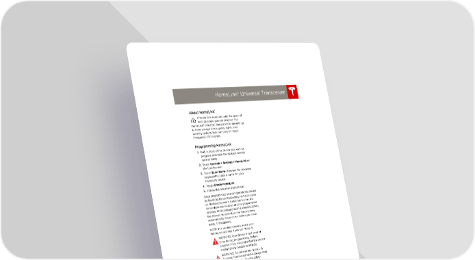 book.book Page 23 Friday, July 19, 2013 12:53 PM HomeLink® Universal Transceiver HomeLink® Universal Transceiver ® About HomeLink If Model S is equipped with the optional tech package, you can program the HomeLink® Universal Transceiver to operate up to three garage doors, gates, lights, and security systems that can transmit Radio Frequency (RF) signals. Programming HomeLink 1. Park in front of the device you want to program, and have the device’s remote control ready. 2. Touch Controls > Settings > HomeLink on the touchscreen. 3. Touch Enter Name, then use the onscreen keyboard to enter a name for your HomeLink device. 4. Touch Create HomeLink. 5. Follow the onscreen instructions. Once programmed, you can operate the device by touching its corresponding HomeLink icon on the touchscreen’s status bar. HomeLink remembers the location of your programmed devices. When you approach a known location, the HomeLink control on the touchscreen automatically drops down. When you drive away, it disappears. NOTE: For security reasons, erase your HomeLink settings if you sell Model S. WARNING: Your device might open or close during programming. Before programming, make sure that the device is clear of any people or objects. WARNING: Do not use the HomeLink Universal Transceiver with a garage door that does not meet federal safety standards. A garage door opener that cannot detect an object in its path and then automatically stop and reverse, does not meet these standards. Using a garage door opener without these features increases the risk of injury or death. USING THE TOUCHSCREEN 5.23