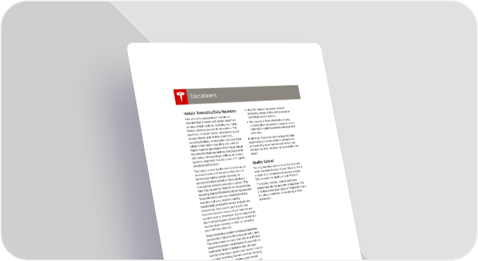 book.book Page 2 Friday, July 19, 2013 12:53 PM Disclaimers Disclaimers CDOiscNlaSUimMeErsR INFORMATION • Used for research purposes without Vehicle Telematics/Data Recorders This vehicle is equipped with electronic disclosing details of the vehicle owner or modules that monitor and record data from identification information. various vehicle systems, including the motor, • Disclosed to a Tesla affiliated company, Battery, braking and electrical systems. The including their successors or assigns, or our electronic modules record information about information systems and data management various driving and vehicle conditions, providers. including braking, acceleration, trip and other In addition, Tesla does not disclose the data related information regarding your vehicle. recorded to an owner unless it pertains to a These modules also record information about non-warranty repair service and in this case, the vehicle’s features such as charging events will disclose only the data that is related to the and status, the enabling/disabling of various repair. systems, diagnostic trouble codes, VIN, speed, direction and location. Quality Control The data is stored by the vehicle and may be You might notice a few kms on the odometer accessed, used and stored by Tesla service when you take delivery of your Model S. This is technicians during vehicle servicing or a result of a comprehensive testing process periodically transmitted to Tesla wirelessly that ensures the quality of your Model S. through the vehicle’s telematics system. This data may be used by Tesla for various purposes, The testing process includes extensive including, but not limited to: providing you with inspections during and after production. The Tesla telematics services; troubleshooting; final inspection takes place at Tesla Motors and evaluation of your vehicle’s quality, includes a road test conducted by a Tesla functionality and performance; analysis and technician. research by Tesla and its partners for the improvement and design of our vehicles and systems; and as otherwise may be required by law. In servicing your vehicle, we can potentially resolve issues remotely simply by reviewing your vehicle’s data log. Tesla’s telematics system wirelessly transmits vehicle information to Tesla on a periodic basis. The data is used as described above and helps ensure the proper maintenance of your vehicle. Additional Model S features may use your vehicle’s telematics system and the information provided, including features such as charging reminders, software updates, and remote access to, and control of, various systems of your vehicle. Tesla does not disclose the data recorded in your vehicle to any third party except when: • An agreement or consent from the vehicle’s owner (or the leasing company for a leased vehicle) is obtained. • Officially requested by the police or other authorities. • Used as a defense for Tesla in a lawsuit. • Ordered by a court of law. 10.2 MODEL S OWNERS MANUAL