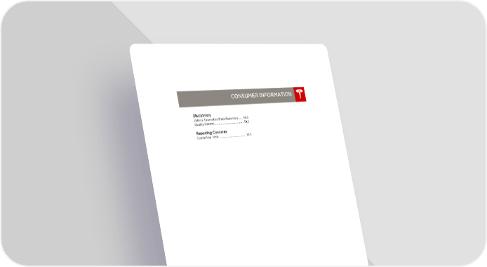 book.book Page 1 Friday, July 19, 2013 12:53 PM CONSUMER INFORMATION Disclaimers Vehicle Telematics/Data Recorders....... 10.2 Quality Control................................................ 10.2 Reporting Concerns Contacting Tesla............................................. 10.3 10.1