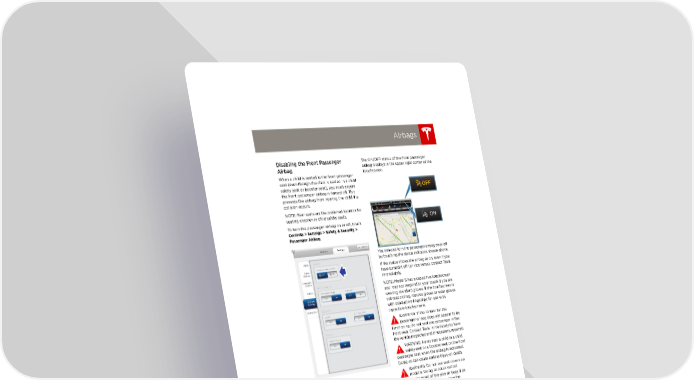 book.book Page 17 Friday, July 19, 2013 12:53 PM Airbags Disabling the Front Passenger The ON/OFF status of the front passenger Airbag airbag displays in the upper right corner of the When a child is seated in the front passenger touchscreen. seat (even though the child is seated in a child safety seat or booster seat), you must ensure the front passenger airbag is turned off. This prevents the airbag from injuring the child if a collision occurs. NOTE: Rear seats are the preferred location for seating children in child safety seats. To turn the passenger airbag on or off, touch Controls > Settings > Safety & Security > Passenger Airbag. You can also turn the passenger airbag on or off by touching the status indicator, shown above. If the status shows the airbag as on, even if you have turned it off (or vice versa), contact Tesla immediately. NOTE: Model S has a capacitive touchscreen and may not respond to your touch if you are wearing standard gloves. If the touchscreen is not responding, remove gloves or wear gloves with conductive fingertips for use with capacitive touchscreens. WARNING: If the control for the passenger airbag does not appear to be functioning, do not seat any passenger in the front seat. Contact Tesla immediately to have the vehicle inspected and if necessary, repaired. WARNING: Never seat a child in a child safety seat or a booster seat on the front passenger seat when the airbag is activated. Doing so can cause serious injury or death. WARNING: Do not use seat covers on Model S. Doing so could restrict deployment of the side air bags if an accident occurs. It can also reduce the accuracy of the occupant detection system. SEATING AND SAFETY RESTRAINTS 3.17