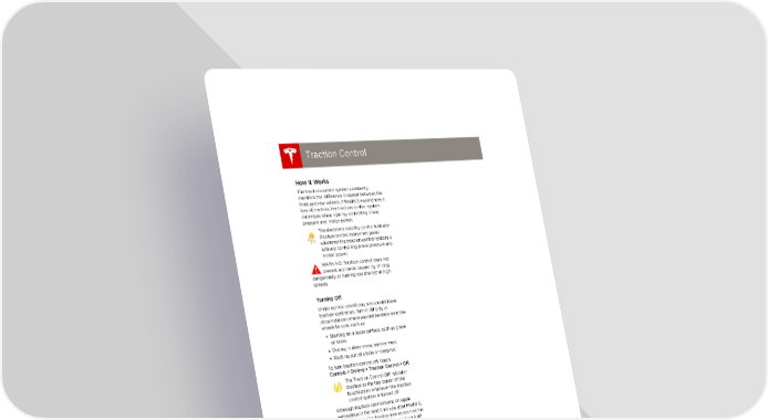 book.book Page 22 Friday, July 19, 2013 12:53 PM Traction Control Traction Control Traction Control How It Works The traction control system constantly monitors the difference in speed between the front and rear wheels. If Model S experiences a loss of traction, the traction control system minimizes wheel spin by controlling brake pressure and motor power. The electronic stability control indicator displays on the instrument panel whenever the traction control system is actively controlling brake pressure and motor power. WARNING: Traction control does not prevent accidents caused by driving dangerously or turning too sharply at high speeds. Turning Off Under normal conditions, you should leave traction control on. Turn it off only in circumstances where you deliberately want the wheels to spin, such as: • Starting on a loose surface, such as gravel or snow. • Driving in deep snow, sand or mud. • Rocking out of a hole or deep rut. To turn traction control off, touch Controls > Driving > Traction Control > Off. The Traction Control Off indicator TC displays at the top center of the touchscreen whenever the traction control system is turned off. Although traction control turns on again automatically the next time you start Model S, turn it on using the touchscreen as soon as the circumstances that required you to turn it off have passed. 4.22 MODEL S OWNERS MANUAL