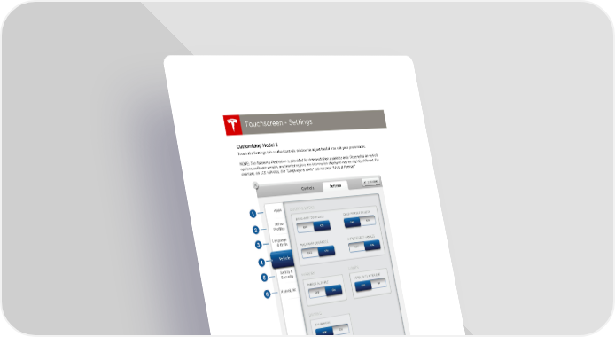 book.book Page 6 Friday, July 19, 2013 12:53 PM Touchscreen - Settings Touchscreen - Settings Touchscreen - Settings Customizing Model S Touch the Settings tab on the Controls window to adjust Model S to suit your preferences. NOTE: The following illustration is provided for demonstration purposes only. Depending on vehicle options, software version, and market region, the information displayed may be slightly different. For example, on U.S. vehicles, the “Language & UnitsŽ tab is called “Units & Format.Ž 5.6 MODEL S OWNERS MANUAL