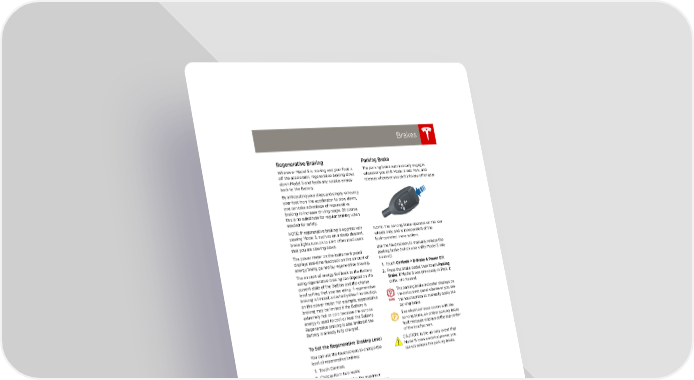 book.book Page 21 Friday, July 19, 2013 12:53 PM Brakes Regenerative Braking Parking Brake Whenever ModelS is moving and your foot is The parking brake automatically engages off the accelerator, regenerative braking slows whenever you shift Model S into Park, and down ModelS and feeds any surplus energy releases whenever you shift into any other gear. back to the Battery. By anticipating your stops and simply removing your foot from the accelerator to slow down, you can take advantage of regenerative braking to increase driving range. Of course, this is no substitute for regular braking when needed for safety. NOTE: If regenerative braking is aggressively NOTE: The parking brake operates on the rear slowing Model S, such as on a steep descent, wheels only, and is independent of the brake lights turn on to alert other road users foot-operated brake system. that you are slowing down. Use the touchscreen to manually release the The power meter on the instrument panel parking brake (which also shifts Model S into displays real-time feedback on the amount of Neutral): energy being gained by regenerative braking. 1. Touch Controls > E-Brake & Power Off. The amount of energy fed back to the Battery 2. Press the brake pedal, then touch Parking using regenerative braking can depend on the Brake. If Model S was previously in Park, it current state of the Battery and the charge shifts into Neutral. level setting that you are using. If regenerative braking is limited, a dashed yellow line displays The parking brake indicator displays on on the power meter. For example, regenerative the instrument panel whenever you use braking may be limited if the Battery is the touchscreen to manually apply the extremely hot or cold because the surplus parking brake. energy is used to cool or heat the Battery. If an electrical issue occurs with the Regenerative braking is also limited if the parking brake, an amber parking brake Battery is already fully charged. fault message displays at the top center of the touchscreen. To Set the Regenerative Braking Level CAUTION: In the unlikely event that You can use the touchscreen to change the ModelS loses electrical power, you level of regenerative braking: cannot release the parking brake. 1. Touch Controls. 2. Choose from two levels: • Standard - provides the maximum amount of regenerative braking. When you release the accelerator, Model S slows down faster, reducing the need to use the brakes. • Low - limits the amount of regenerative braking. When you release the accelerator, Model S takes longer to slow down and coasts further. NOTE: Regenerative braking resets to Standard each time you start Model S. DRIVING 4.21