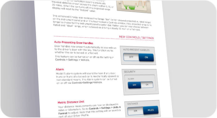 TESLA MOTORS -‐ SOFTWARE UPDATE NOTIFICATION Energy App The Energy app on the touchscreen has been updated to visually highlight the connection between projected range and energy consumption by showing projected range directly on the energy chart. By default, it displays the “Instant” projected range, which reflects consumption over the last tenth of a mile. You can also adjust the chart to see projected range based on average energy consumption over the previously traveled distance shown across the chart—either 5, 15, or 30 miles. When the car turns off, the projected range display will reset to the “Instant” value. This enhanced Energy app replaces the Range "bar" (which showed projected vs. rated range) on the instrument panel and on the touchscreen's Controls window. Also, projected range is no longer a choice for the instrument panel's center dial. Rather, you can now choose between Rated and "Ideal" range, which is based on driving a steady 55 mph on a flat road. NEW CONTROLS / SETTINGS Auto-Presenting Door Handles Door handles now present automatically as you walk up to the driver’s door with the key. This function works whether the car is locked or unlocked. This feature can be turned on or off via the setting in Controls > Settings > Vehicle. Alarm Model S alarm system will sound the horn if any door, trunk or frunk of a locked car is mechanically opened by non-standard means. The Alarm system can be turned on or off via Controls>Settings>Vehicle. Metric Distance Unit Your distance measurements can now be displayed in miles or kilometers. Go to Controls > Settings > Units & Format to adjust. Note that this setting will be saved as part of your Driver Profile. This setting will affect the following areas in the touchscreen and instrument panel: • Range • Speedometer • Energy chart • Trip meters • Google Maps search results & turn-by-turn driving directions