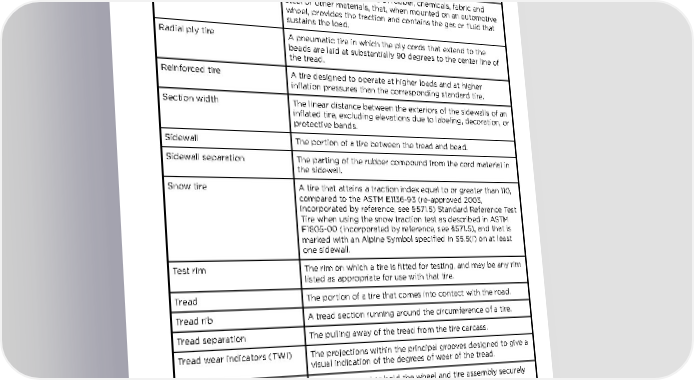 Wheels and Tires Overall width The linear distance between the exteriors of the sidewalls of an inflated tire, including elevations due to labeling, decorations, or protective bands or ribs. Ply A layer of rubber-coated parallel cords. Ply separation A parting of rubber compound between adjacent plies. Pneumatic tire A mechanical device made of rubber, chemicals, fabric and steel or other materials, that, when mounted on an automotive wheel, provides the traction and contains the gas or fluid that sustains the load. Radial ply tire A pneumatic tire in which the ply cords that extend to the beads are laid at substantially 90 degrees to the center line of the tread. Reinforced tire A tire designed to operate at higher loads and at higher inflation pressures than the corresponding standard tire. Section width The linear distance between the exteriors of the sidewalls of an inflated tire, excluding elevations due to labeling, decoration, or protective bands. Sidewall The portion of a tire between the tread and bead. Sidewall separation The parting of the rubber compound from the cord material in the sidewall. Snow tire A tire that attains a traction index equal to or greater than 110, compared to the ASTM E1136-93 (re-approved 2003, incorporated by reference, see §571.5) Standard Reference Test Tire when using the snow traction test as described in ASTM F1805-00 (incorporated by reference, see §571.5), and that is marked with an Alpine Symbol specified in S5.5(i) on at least one sidewall. Test rim The rim on which a tire is fitted for testing, and may be any rim listed as appropriate for use with that tire. Tread The portion of a tire that comes into contact with the road. Tread rib A tread section running around the circumference of a tire. Tread separation The pulling away of the tread from the tire carcass. Tread wear indicators (TWI) The projections within the principal grooves designed to give a visual indication of the degrees of wear of the tread. Wheel-holding fixture The fixture used to hold the wheel and tire assembly securely during testing. Specifications 213