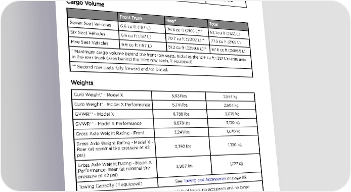 Dimensions and Weights Shoulder Room Front 60.7 in 1542 mm Rear 56.8 in 1442 mm Third 40 in 1016 mm Front 55.6 in 1412 mm Hip Room Rear 59 in 1498 mm Third 38.5 in 978 mm Cargo Volume Front Trunk Rear* Total Seven Seat Vehicles 6.6 cu ft (187 L) 76.5 cu ft (2166 L)** 83.1 cu ft (2353 L) Six Seat Vehicles 6.6 cu ft (187 L) 70.7 cu ft (2002 L)** 77.3 cu ft (2189 L) Five Seat Vehicles 6.6 cu ft (187 L) 81.2 cu ft (2299.5 L)** 87.8 cu ft (2486.5 L) * Maximum cargo volume behind the front row seats. Includes the 12.6 cu ft (357 L) cargo area in the rear trunk (area behind the third row seats, if equipped). ** Second row seats fully forward and/or folded. Weights Curb Weight* - Model X 5,631 lbs 2,554 kg Curb Weight* - Model X Performance 5,741 lbs 2,604 kg GVWR** - Model X 6,788 lbs 3,079 kg GVWR** - Model X Performance 6,878 lbs 3,120 kg Gross Axle Weight Rating - Front 3,241 lbs 1,470 kg Gross Axle Weight Rating - Model X - Rear (at nominal tire pressure of 42 3,792 lbs 1,720 kg psi) Gross Axle Weight Rating - Model X Performance- Rear (at nominal tire 3,807 lbs 1,727 kg pressure of 42 psi) Towing Capacity (if equipped) See Towing and Accessories on page 86. *Curb Weight = weight of the vehicle with correct fluid levels, no occupants and no cargo **GVWR = Gross Vehicle Weight Rating Note: Values are approximate. Weights can vary depending on a vehicle's options. 202 Model X Owner's Manual
