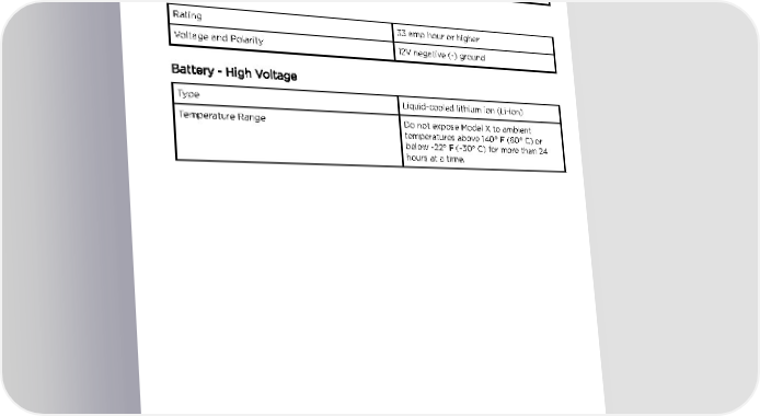 Subsystems Suspension Front Independent, virtual pivot double wishbone Rear Independent, virtual pivot double wishbone Battery - 12V Rating 33 amp hour or higher Voltage and Polarity 12V negative (-) ground Battery - High Voltage Type Liquid-cooled lithium ion (Li-ion) Temperature Range Do not expose Model X to ambient temperatures above 140° F (60° C) or below -22° F (-30° C) for more than 24 hours at a time. Specifications 205