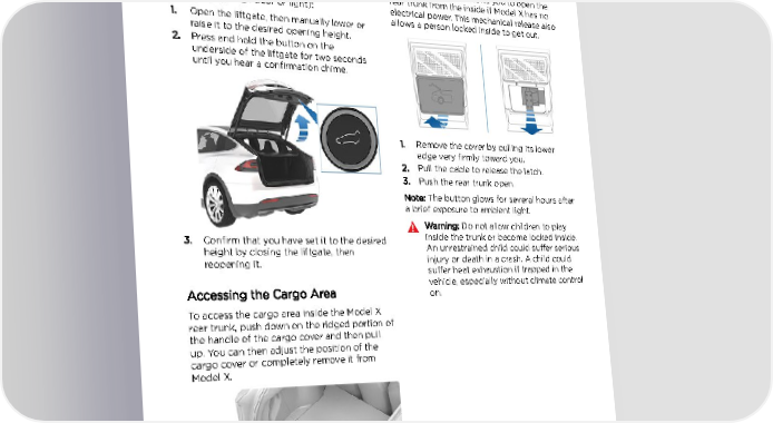 Rear Trunk Note: The power closing feature is also 285 lbs (130 kg) in the lower trunk temporarily disabled if you leave the powered compartment. Doing so can cause liftgate open for more than an hour. damage. Adjusting Liftgate Opening Height Interior Emergency Trunk Release You can adjust the opening height of the An illuminated mechanical release located powered liftgate to make it easier to reach or inside the rear trunk allows you to open the to avoid low-hanging ceilings or objects (for rear trunk from the inside if Model X has no example, a garage door or light): electrical power. This mechanical release also 1. Open the liftgate, then manually lower or allows a person locked inside to get out. raise it to the desired opening height. 2. Press and hold the button on the underside of the liftgate for two seconds until you hear a confirmation chime. 1. Remove the cover by pulling its lower edge very firmly toward you. 2. Pull the cable to release the latch. 3. Push the rear trunk open. Note: The button glows for several hours after a brief exposure to ambient light. Warning: Do not allow children to play 3. Confirm that you have set it to the desired inside the trunk or become locked inside. height by closing the liftgate, then An unrestrained child could suffer serious reopening it. injury or death in a crash. A child could suffer heat exhaustion if trapped in the Accessing the Cargo Area vehicle, especially without climate control on. To access the cargo area inside the Model X rear trunk, push down on the ridged portion of the handle of the cargo cover and then pull up. You can then adjust the position of the cargo cover or completely remove it from Model X. Caution: Never load more than 175 lbs (80 kg) on the rear load floor (above the lower trunk compartment) or more than Opening and Closing 17