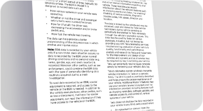 Disclaimers Disclaimers Event Data Recorder (EDR) Vehicle Telematics Model X is equipped with an event data Model X is equipped with electronic modules recorder (EDR). The main purpose of an EDR that monitor and record data from various is to record, in certain crash or near crash-like vehicle systems, including the motor, Autopilot situations, such as an air bag deployment or components, Battery, braking and electrical hitting a road obstacle, data that will assist in systems. The electronic modules record understanding how a vehicle's systems information about various driving and vehicle performed. The EDR is designed to record conditions, including braking, acceleration, trip data related to vehicle dynamics and safety and other related information regarding your systems for a short period of time, typically 30 vehicle. These modules also record seconds or less. The EDR in Model X is information about the vehicle‡s features such designed to record data such as: as charging events and status, the enabling/ • How various systems in your vehicle were disabling of various systems, diagnostic operating; trouble codes, VIN, speed, direction and • Whether or not the driver and passenger location. safety belts were buckled/fastened; The data is stored by the vehicle and may be • How far (if at all) the driver was accessed, used and stored by Tesla service depressing the accelerator and/or brake technicians during vehicle servicing or pedal; and, periodically transmitted to Tesla wirelessly • How fast the vehicle was traveling. through the vehicle‡s telematics system. This data may be used by Tesla for various The data can help provide a better purposes, including, but not limited to: understanding of the circumstances in which providing you with Tesla telematics services; crashes and injuries occur. troubleshooting; evaluation of your vehicle‡s Note: EDR data is recorded by your vehicle quality, functionality and performance; only if a non-trivial crash situation occurs; no analysis and research by Tesla and its partners data is recorded by the EDR under normal for the improvement and design of our driving conditions and no personal data (e.g., vehicles and systems; and as otherwise may name, gender, age, and crash location) is be required by law. In servicing your vehicle, recorded. However, other parties, such as law Tesla can potentially resolve issues remotely enforcement, could combine the EDR data simply by reviewing your vehicle‡s data log. with the type of personally identifying data Tesla‡s telematics system wirelessly transmits routinely acquired during a crash vehicle information to Tesla on a periodic investigation. basis. The data is used as previously described To read data recorded by an EDR, special and helps ensure the proper maintenance of equipment is required, and access to the your vehicle. Additional Model X features may vehicle or the EDR is needed. In addition to use your vehicle‡s telematics system and the the vehicle manufacturer, other parties, such information provided, including features such as law enforcement, that have the special as charging reminders, software updates, and equipment, can read the information if they remote access to, and control of, various have access to the vehicle or the EDR. systems of your vehicle. Tesla does not disclose the data recorded in your vehicle to any third party except when: • An agreement or consent from the vehicle‡s owner (or the leasing company for a leased vehicle) is obtained. • Officially requested by the police or other authorities. • Used as a defense for Tesla in a lawsuit. • Ordered by a court of law. • Used for research purposes without disclosing details of the vehicle owner or identification information. Consumer Information 221