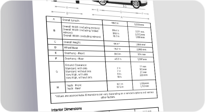 Dimensions and Weights Dimensions and Weights Exterior Dimensions A Overall Length 198.3 in 5,036 mm Overall Width (including mirrors) 89.4 in 2,271 mm B Overall Width (including folded 81.6 in 2,072 mm mirrors) 78.7 in 1,999 mm Overall Width (excluding mirrors) C Overall Height 66 in* 1,684 mm* D Wheel Base 116.7 in 2,965 mm E Overhang - Front 38.3 in 974 mm F Overhang - Rear 43.2 in 1,097 mm Ground Clearance: 171 mm Standard, with skis 7 in 183 mm G Standard, without skis 7 in 211 mm Very high, with skis 8 in 223 mm Very high, without skis 9 in H Track - Front 67.1 in 1,705 mm Track - Rear 67.3 in 1,710 mm *Values are approximate. Dimensions can vary depending on a vehicle's options and various other factors. Interior Dimensions Head Room Front 41.7 in 1059 mm Rear 40.9 in 1039 mm Third 37.1 in 942 mm Leg Room 41.2 in 1046 mm Front Rear 38.4 in 975 mm Third 32.7 in 831 mm Specifications 201