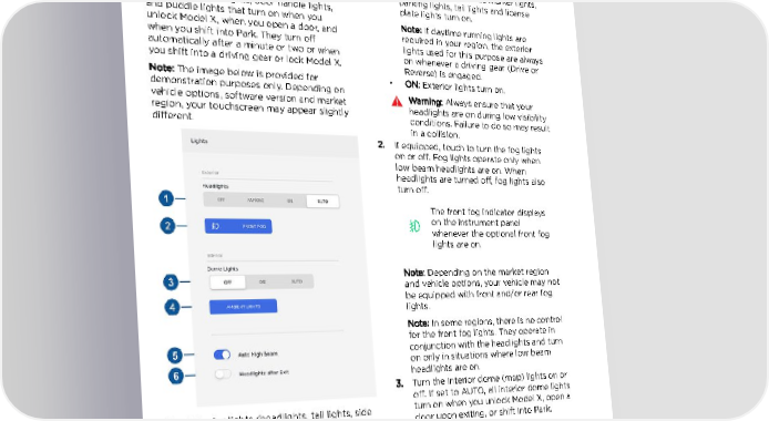 Lights Lights Controlling Lights • OFF: Exterior lights turn off until you manually turn them back on or until Touch Controls > Lights on the touchscreen to the next time you drive. If daytime control the lights. running lights are required in your In addition to the lights that you can control region, the exterior lights used for this from the touchscreen, Model X has purpose are always on when Drive convenience lights that turn on and off gear is engaged. automatically based on what you are doing. • PARKING: Only the side marker lights, For example, you will notice interior lights, parking lights, tail lights and license marker lights, tail lights, door handle lights, plate lights turn on. and puddle lights that turn on when you Note: If daytime running lights are unlock Model X, when you open a door, and required in your region, the exterior when you shift into Park. They turn off lights used for this purpose are always automatically after a minute or two or when on whenever a driving gear (Drive or you shift into a driving gear or lock Model X. Reverse) is engaged. Note: The image below is provided for • ON: Exterior lights turn on. demonstration purposes only. Depending on Warning: Always ensure that your vehicle options, software version and market headlights are on during low visibility region, your touchscreen may appear slightly conditions. Failure to do so may result different. in a collision. 2. If equipped, touch to turn the fog lights on or off. Fog lights operate only when low beam headlights are on. When headlights are turned off, fog lights also turn off. The front fog indicator displays on the instrument panel whenever the optional front fog lights are on. Note: Depending on the market region and vehicle options, your vehicle may not be equipped with front and/or rear fog lights. Note: In some regions, there is no control for the front fog lights. They operate in conjunction with the headlights and turn on only in situations where low beam headlights are on. 3. Turn the interior dome (map) lights on or off. If set to AUTO, all interior dome lights 1. Exterior lights (headlights, tail lights, side turn on when you unlock Model X, open a marker lights, parking lights, and license door upon exiting, or shift into Park. plate lights) are set to AUTO each time Note: You can also manually turn an you start Model X. When set to AUTO, individual dome light on or off by pressing exterior lights automatically turn on when its lens. If you manually turn a dome light driving in low lighting conditions. If you on, it turns off when Model X powers off. If change to a different setting, lights always Model X was already powered off when revert to AUTO on your next drive. you manually turned the light on, it turns Touch one of these options to temporarily off after 60 minutes. change the exterior light setting: 4. If you turn on AMBIENT LIGHTS, interior ambient lights turn on whenever the headlights are on. 58 Model X Owner's Manual