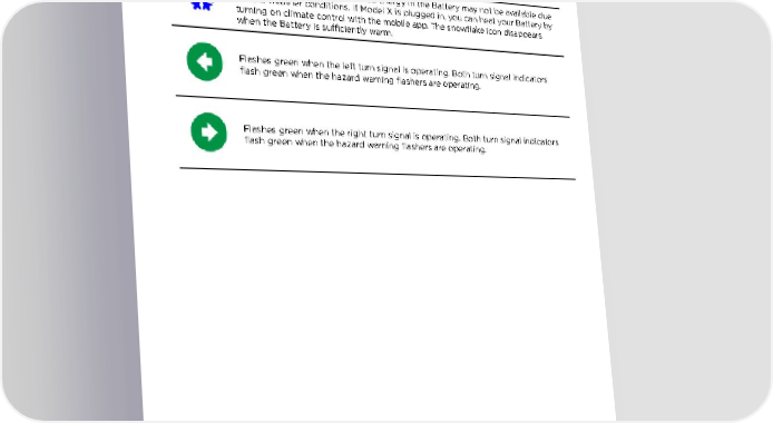 Instrument Panel Indicator Description Trailer mode (if equipped) is active. See Towing and Accessories on page 86. Appears when some of the stored energy in the Battery may not be available due to cold weather conditions. If Model X is plugged in, you can heat your Battery by turning on climate control with the mobile app. The snowflake icon disappears when the Battery is sufficiently warm. Flashes green when the left turn signal is operating. Both turn signal indicators flash green when the hazard warning flashers are operating. Flashes green when the right turn signal is operating. Both turn signal indicators flash green when the hazard warning flashers are operating. Driving 65