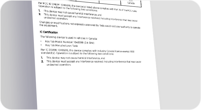Declarations of Conformity Declarations of Conformity Key and Passive Unlocking System FCC Certification Model Number Mfr GHz Tested For Key fob 1048598 Tesla 2.4 USA Canada Per FCC ID 2AEIM-1048598, the device(s) listed above complies with Part 15 of the FCC rules. Operation is subject to the following two conditions: 1. This device may not cause harmful interference, and 2. This device must accept any interference received, including interference that may cause undesired operation. Changes or modifications not expressly approved by Tesla could void your authority to operate the equipment. IC Certification The following device is used in vehicles in Canada: • Key fob Model Number: 1048598 (2.4 GHz) • Key fob Manufacturer: Tesla Per IC 20098-1048598, this device complies with Industry Canada license-exempt RSS standard(s). Operation is subject to the following two conditions: 1. This device may not cause harmful interference, and 2. This device must accept any interference received, including interference that may cause undesired operation. 224 Model X Owner's Manual