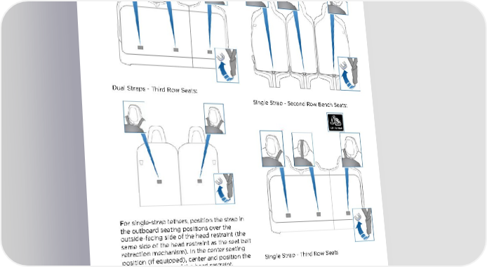 Child Safety Seats Dual Straps - Second Row Bench Seats: Dual Straps - Third Row Seats: Single Strap - Second Row Bench Seats: For single-strap tethers, position the strap in the outboard seating positions over the outside-facing side of the head restraint (the same side of the head restraint as the seat belt retraction mechanism). In the center seating position (if equipped), center and position the Single Strap - Third Row Seats strap over the top of the head restraint. Single Strap - Second Row Monopost Seats: Seating and Safety Restraints 39