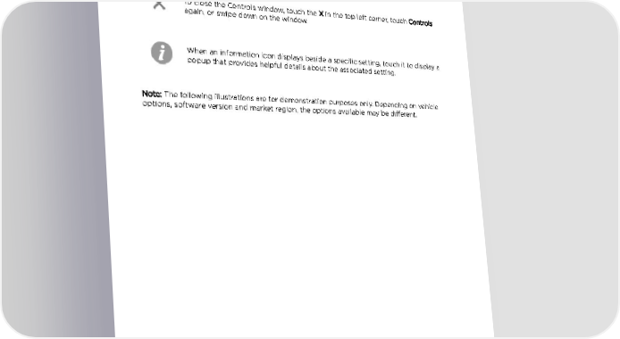 Controls Using the Touchscreen Controls Overview Touch Controls on the bottom corner of the touchscreen to control features and customize Model X to suit your preferences. The Controls window appears over the map. Touch an option on the left side of the window to display the associated controls and settings. By default, Quick Controls displays for quicker access to commonly used settings. To close the Controls window, touch the X in the top left corner, touch Controls again, or swipe down on the window. When an information icon displays beside a specific setting, touch it to display a popup that provides helpful details about the associated setting. Note: The following illustrations are for demonstration purposes only. Depending on vehicle options, software version and market region, the options available may be different. Using the Touchscreen 129