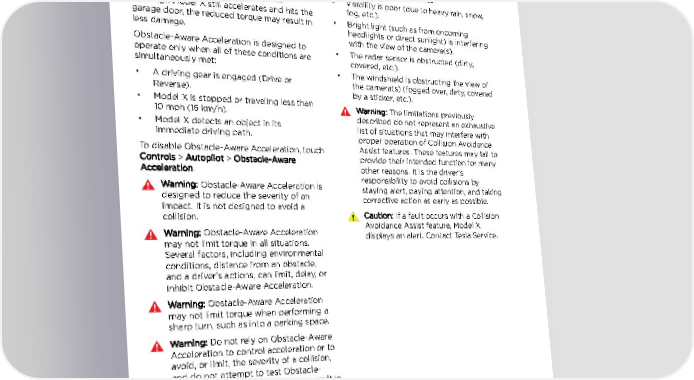 Collision Avoidance Assist Obstacle-Aware Acceleration Limitations and Inaccuracies Obstacle-Aware Acceleration is designed to Collision Avoidance features cannot always reduce the impact of a collision by reducing detect all objects, vehicles, bikes, or motor torque and in some cases applying the pedestrians, and you may experience brakes, if Model X detects an object in its unnecessary, inaccurate, invalid, or missed driving path. For example, Model X, while warnings for many reasons, particularly if: parked in front of a closed garage door with • The road has sharp curves. the Drive gear engaged, detects that you have • Visibility is poor (due to heavy rain, snow, pressed hard on the accelerator pedal. fog, etc.). Although Model X still accelerates and hits the garage door, the reduced torque may result in • Bright light (such as from oncoming less damage. headlights or direct sunlight) is interfering Obstacle-Aware Acceleration is designed to with the view of the camera(s). operate only when all of these conditions are • The radar sensor is obstructed (dirty, simultaneously met: covered, etc.). • The windshield is obstructing the view of • A driving gear is engaged (Drive or the camera(s) (fogged over, dirty, covered Reverse). by a sticker, etc.). • Model X is stopped or traveling less than Warning: The limitations previously 10 mph (16 km/h). described do not represent an exhaustive • Model X detects an object in its list of situations that may interfere with immediate driving path. proper operation of Collision Avoidance To disable Obstacle-Aware Acceleration, touch Assist features. These features may fail to Controls > Autopilot > Obstacle-Aware provide their intended function for many Acceleration. other reasons. It is the driver‡s Warning: Obstacle-Aware Acceleration is responsibility to avoid collisions by designed to reduce the severity of an staying alert, paying attention, and taking impact. It is not designed to avoid a corrective action as early as possible. collision. Caution: If a fault occurs with a Collision Warning: Obstacle-Aware Acceleration Avoidance Assist feature, Model X may not limit torque in all situations. displays an alert. Contact Tesla Service. Several factors, including environmental conditions, distance from an obstacle, and a driver's actions, can limit, delay, or inhibit Obstacle-Aware Acceleration. Warning: Obstacle-Aware Acceleration may not limit torque when performing a sharp turn, such as into a parking space. Warning: Do not rely on Obstacle-Aware Acceleration to control acceleration or to avoid, or limit, the severity of a collision, and do not attempt to test Obstacle- Aware Acceleration. Doing so can result in serious property damage, injury, or death. Warning: Several factors can affect the performance of Obstacle-Aware Acceleration, causing an inappropriate or untimely reduction in motor torque and/or undesired braking. It is the driver's responsibility to drive safely and remain in control of Model X at all times. 126 Model X Owner's Manual