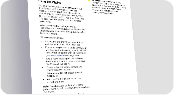 Tire Care and Maintenance Driving in Low Temperatures Caution: Do not use chains on a Model X equipped with 22" tires and do not use Tire performance is reduced in low ambient tire chains on front tires. temperatures, resulting in reduced grip and an Caution: Never deflate your tires to put on increased susceptibility to damage from tire chains. When re-inflated, the chains impacts. Performance tires can temporarily might fit too tightly and cause tire harden when cold, causing you to hear damage. rotational noise for the first few miles (kilometers) until the tires warm up. Caution: Ensure that the tire chains cannot touch suspension components or Using Tire Chains brake lines. If you hear the chains making unusual noises that would indicate Tesla has tested and approved Maggie Group contact with Model X, stop and Trak Special LT51 tire chains to increase investigate immediately. traction in snowy conditions. These chains should only be installed on rear 19 or 20" tires. Do not use chains on 22" tires or on front tires. The approved tire chains can be purchased from Tesla. When installing tire chains, follow the instructions and warnings provided by the tire chain manufacturer. Mount them evenly and as tight as possible. When using tire chains: • Inspect the tire chains for loose fittings and damaged links before each use. • Ensure air suspension is set to STANDARD and Suspension Lowering is set to NEVER for vehicles equipped with air suspension (see Air Suspension on page 157). • Avoid heavily loading Model X (heavy loads can reduce the clearance between the tires and the body). • Do not drive the vehicle without the chains properly installed. • Drive slowly. Do not exceed 30 mph (48 km/h). • Remove the tire chains as soon as conditions allow. Note: Tire chains are prohibited in some jurisdictions. Check local laws before installing tire chains. Caution: Vehicles equipped with air suspension should remain in the STANDARD ride height setting to avoid damage. Caution: Using non-recommended tire chains, or using tire chains on other sized tires can damage the suspension, body, wheels, and/or brake lines. Damage caused by using non-recommended tire chains, or incorrectly installing tire chains, is not covered by the warranty. Maintenance 189