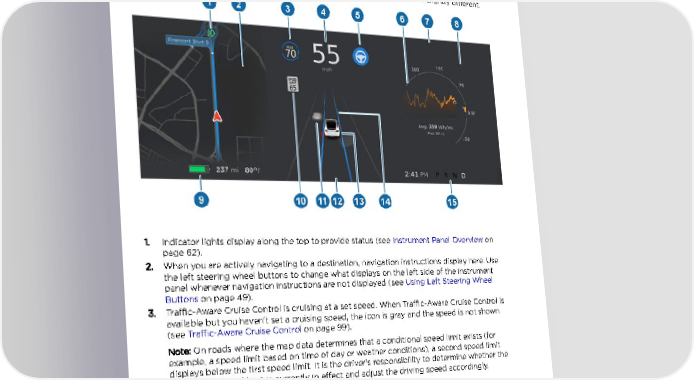 Instrument Panel Instrument Panel - Driving When Model X is driving (or ready to drive), the instrument panel shows your current driving status and a real-time visualization of the road as detected by the Autopilot components (see About Autopilot on page 96). The visualization automatically zooms in and out as needed to inform you when a vehicle is detected in your blind spot. Note: The following illustration is provided for demonstration purposes only. Depending on vehicle options, software version, and market region, the information displayed may be slightly different. 1. Indicator lights display along the top to provide status (see Instrument Panel Overview on page 62). 2. When you are actively navigating to a destination, navigation instructions display here. Use the left steering wheel buttons to change what displays on the left side of the instrument panel whenever navigation instructions are not displayed (see Using Left Steering Wheel Buttons on page 49). 3. Traffic-Aware Cruise Control is cruising at a set speed. When Traffic-Aware Cruise Control is available but you haven't set a cruising speed, the icon is gray and the speed is not shown (see Traffic-Aware Cruise Control on page 99). Note: On roads where the map data determines that a conditional speed limit exists (for example, a speed limit based on time of day or weather conditions), a second speed limit displays below the first speed limit. It is the driver's responsibility to determine whether the conditional speed limit is currently in effect and adjust the driving speed accordingly. 4. Driving speed. 5. Autosteer is actively steering Model X. When Autosteer is available but you haven't activated it, the icon is gray (see Autosteer on page 106). 6. On the Energy graph, dashed lines appear on the power meter if Model X is limiting power. The dashed lines appear on the top portion (energy being used) when power available for acceleration is being limited, and on the bottom portion (energy being gained) when power that can be gained by regenerative braking is limited. Model X limits power for many reasons. Here are just a few examples: • Acceleration may be limited when the Battery is reaching a low state of charge or if the powertrain is hot. • Both acceleration and regenerative braking may be limited when the ambient temperature is either very high or very low. 66 Model X Owner's Manual