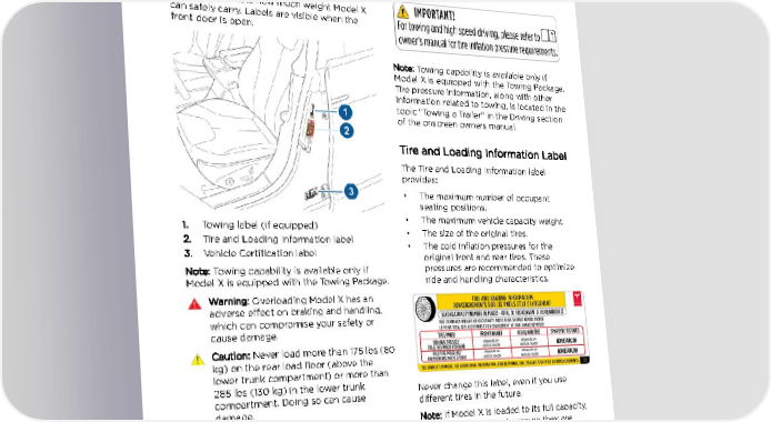 Vehicle Loading Vehicle Loading Load Capacity Labeling Towing Label It is important to understand how much If equipped with the towing package, the weight your Model X can safely carry. This Towing Label instructs you to refer to this weight is called the vehicle capacity weight owner's manual for tire pressures that should and includes the weight of all occupants, be used when towing a trailer. Do not use the cargo and any additional equipment added to tire pressures printed on the Tire and Loading your Model X since it was manufactured. Information Label. One or more labels attached to the center door pillar indicate how much weight Model X can safely carry. Labels are visible when the front door is open. Note: Towing capability is available only if Model X is equipped with the Towing Package. Tire pressure information, along with other information related to towing, is located in the topic "Towing a Trailer" in the Driving section of the onscreen owners manual. Tire and Loading Information Label The Tire and Loading Information label provides: • The maximum number of occupant seating positions. 1. Towing label (if equipped) • The maximum vehicle capacity weight. 2. Tire and Loading Information label • The size of the original tires. 3. Vehicle Certification label • The cold inflation pressures for the original front and rear tires. These Note: Towing capability is available only if pressures are recommended to optimize Model X is equipped with the Towing Package. ride and handling characteristics. Warning: Overloading Model X has an adverse effect on braking and handling, which can compromise your safety or cause damage. Caution: Never load more than 175 lbs (80 kg) on the rear load floor (above the lower trunk compartment) or more than 285 lbs (130 kg) in the lower trunk Never change this label, even if you use compartment. Doing so can cause different tires in the future. damage. Caution: Never load more than 300 lbs Note: If Model X is loaded to its full capacity, (136 kg) in the front trunk. Doing so can double check all tires to ensure they are cause damage. inflated to their recommended pressure levels. Caution: Never store large amounts of Warning: Tire pressures printed on the liquid in Model X. A significant spill can Tire and Loading Information label DO cause electrical components to NOT APPLY to towing. When towing, tire malfunction. pressures must be increased. For information about the tire pressures required when towing, see Towing and Accessories on page 86. Specifications 199