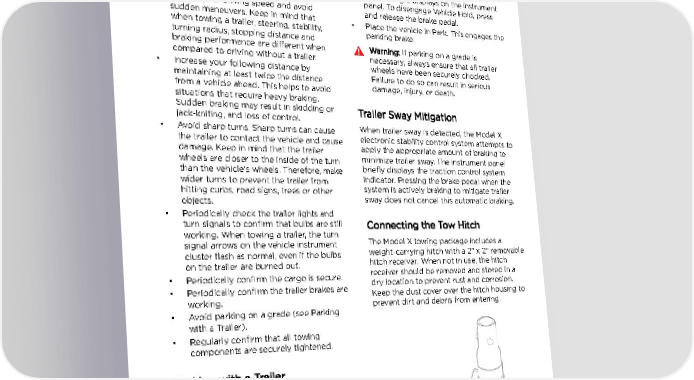Towing and Accessories Towing Guidelines • When the chocks are in place, release the brake pedal and ensure the chocks hold Model X is designed primarily as a passenger- the weight of the vehicle and trailer. carrying vehicle. Towing a trailer puts Note: When testing chocks, ensure that additional load on the motor(s), drive train, Vehicle Hold (see Vehicle Hold on page brakes, tires, and suspension and significantly 76) is not engaged. If Vehicle Hold is decreases range. If you decide to tow a trailer, braking Model X, the Vehicle Hold proceed with caution and follow these general indicator light displays on the instrument guidelines: panel. To disengage Vehicle Hold, press • Reduce your driving speed and avoid and release the brake pedal. sudden maneuvers. Keep in mind that • Place the vehicle in Park. This engages the when towing a trailer, steering, stability, parking brake. turning radius, stopping distance and braking performance are different when Warning: If parking on a grade is compared to driving without a trailer. necessary, always ensure that all trailer • Increase your following distance by wheels have been securely chocked. maintaining at least twice the distance Failure to do so can result in serious from a vehicle ahead. This helps to avoid damage, injury, or death. situations that require heavy braking. Sudden braking may result in skidding or Trailer Sway Mitigation jack-knifing, and loss of control. • Avoid sharp turns. Sharp turns can cause When trailer sway is detected, the Model X the trailer to contact the vehicle and cause electronic stability control system attempts to damage. Keep in mind that the trailer apply the appropriate amount of braking to wheels are closer to the inside of the turn minimize trailer sway. The instrument panel than the vehicle‡s wheels. Therefore, make briefly displays the traction control system wider turns to prevent the trailer from indicator. Pressing the brake pedal when the hitting curbs, road signs, trees or other system is actively braking to mitigate trailer objects. sway does not cancel this automatic braking. • Periodically check the trailer lights and turn signals to confirm that bulbs are still Connecting the Tow Hitch working. When towing a trailer, the turn signal arrows on the vehicle instrument The Model X towing package includes a cluster flash as normal, even if the bulbs weight-carrying hitch with a 2” x 2” removable on the trailer are burned out. hitch receiver. When not in use, the hitch • Periodically confirm the cargo is secure. receiver should be removed and stored in a • Periodically confirm the trailer brakes are dry location to prevent rust and corrosion. working. Keep the dust cover over the hitch housing to • Avoid parking on a grade (see Parking prevent dirt and debris from entering. with a Trailer). • Regularly confirm that all towing components are securely tightened. Parking with a Trailer Whenever possible, avoid parking on a grade. However, if parking on a grade is absolutely necessary, place wheel chocks under the trailer wheels: • One person presses and holds the brake pedal. • A second person places the wheel chocks under the wheels on the downgrade side of the vehicle's tires. Driving 91