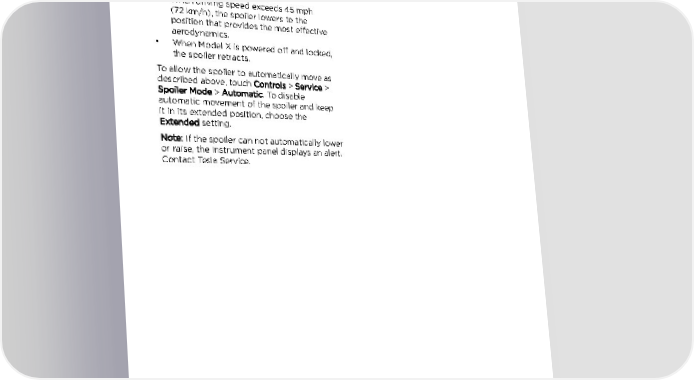 Active Spoiler Active Spoiler Model X has a rear spoiler designed to improve aerodynamics. If Model X is equipped with the active spoiler, the position of the spoiler can vary depending on the status and speed of Model X: • When Model X is in Reverse or when driving speed is below 10 mph (16 km/h), the spoiler provides maximum visibility behind Model X. • When driving speed exceeds 45 mph (72 km/h), the spoiler lowers to the position that provides the most effective aerodynamics. • When Model X is powered off and locked, the spoiler retracts. To allow the spoiler to automatically move as described above, touch Controls > Service > Spoiler Mode > Automatic. To disable automatic movement of the spoiler and keep it in its extended position, choose the Extended setting. Note: If the spoiler can not automatically lower or raise, the instrument panel displays an alert. Contact Tesla Service. Driving 85