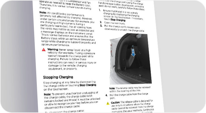 Charging Instructions If the charge port light turns red while Caution: Tesla strongly recommends charging, a fault is detected. Check the leaving Model X plugged in when not in instrument panel or touchscreen for a use. This maintains the Battery at the message describing the fault. A fault can optimum level of charge. occur due to something as common as a power outage. If a power outage occurs, Manually Releasing Charge Cable charging resumes automatically when power is restored. If the usual methods for releasing a charge Note: When charging, particularly at high cable from the charge port (using the charge currents, the refrigerant compressor and fan handle release button, touchscreen, or mobile operate as needed to keep the Battery cool. app) do not work, carefully follow these steps: Therefore, it is normal to hear sounds during 1. Ensure that Model X is not actively charging. charging by displaying the charging Note: Air conditioning performance is screen on the touchscreen. If necessary, generally not affected by charging. However, touch Stop Charging. under certain circumstances (for example, you 2. Open the rear trunk. are charging at high currents during a 3. Pull the charge port's release cable particularly warm day), the air coming from downwards to unlatch the charge cable. the vents may not be as cool as expected and a message displays on the instrument panel. This is normal behavior and ensures that the Battery stays within an optimum temperature range while charging to support longevity and optimum performance. Warning: Never spray liquid at a high velocity (for example, if using a pressure washer) towards the charge port while charging. Failure to follow these instructions can result in serious injury or damage to the vehicle, charging equipment, or property. Stopping Charging Stop charging at any time by disconnecting the charge cable or touching Stop Charging on the touchscreen. Note: The release cable may be recessed Note: To prevent unauthorized unplugging of within the opening of the trim. the charge cable, the charge cable latch 4. Pull the charge cable from the charge remains locked and Model X must be unlocked port. or able to recognize your key before you can Caution: The release cable is designed for disconnect the charge cable. use only in situations where the charge To disconnect the charge cable: cable cannot be released from the charge 1. Press and hold the button on the port using the usual methods. Continuous connector handle to release the latch. use may result in damage to the release Alternatively, unlock the vehicle by cable or charging equipment. opening a door, using a key fob, or Warning: Do not perform this procedure touching Stop Charging on the while your vehicle is charging or if any touchscreen. These methods unlock the orange high voltage conductors are charge port as well. exposed. Failure to follow these 2. Pull the connector from the charge port. instructions can result in electric shock 3. Push the charge port door closed. and serious injury or damage to the vehicle. If you have any uncertainty as to Note: If Model X is equipped with a motorized how to safely perform this procedure, charge port door, it automatically closes contact your closest Service Center. shortly after you remove the charge cable. 176 Model X Owner's Manual