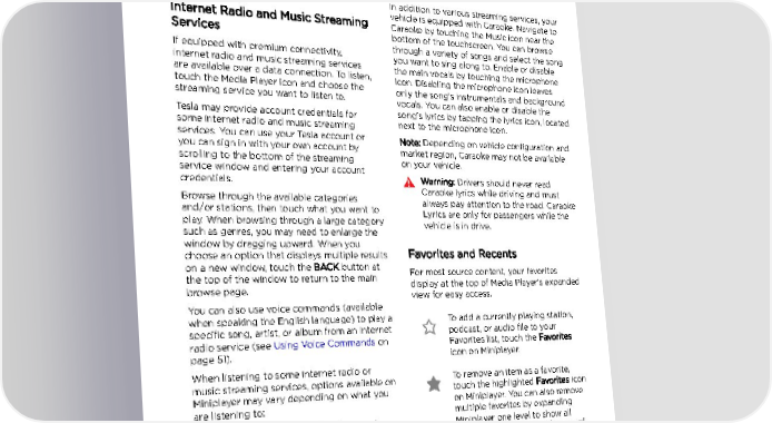 Media and Audio 1. Touch the radio source icon, then select Note: When playing a podcast (if applicable), SiriusXM from the list. you can rewind or fast forward to any location 2. Move the channel selector to channel 0. in the show. On the Miniplayer, drag the slider 3. The Radio ID displays in the station to the desired location or touch the rewind/ information area. fast forward icons to move back or forward 15 seconds at a time. To select a SiriusXM channel, you can either manually scroll through channel numbers, or Caraoke you can browse channels by category. In addition to various streaming services, your Internet Radio and Music Streaming vehicle is equipped with Caraoke. Navigate to Caraoke by touching the Music icon near the Services bottom of the touchscreen. You can browse If equipped with premium connectivity, through a variety of songs and select the song internet radio and music streaming services you want to sing along to. Enable or disable are available over a data connection. To listen, the main vocals by touching the microphone touch the Media Player icon and choose the icon. Disabling the microphone icon leaves streaming service you want to listen to. only the song's instrumentals and background vocals. You can also enable or disable the Tesla may provide account credentials for song's lyrics by tapping the lyrics icon, located some internet radio and music streaming next to the microphone icon. services. You can use your Tesla account or Note: Depending on vehicle configuration and you can sign in with your own account by market region, Caraoke may not be available scrolling to the bottom of the streaming on your vehicle. service window and entering your account credentials. Warning: Drivers should never read Browse through the available categories Caraoke lyrics while driving and must and/or stations, then touch what you want to always pay attention to the road. Caraoke play. When browsing through a large category Lyrics are only for passengers while the such as genres, you may need to enlarge the vehicle is in drive. window by dragging upward. When you Favorites and Recents choose an option that displays multiple results on a new window, touch the BACK button at For most source content, your favorites the top of the window to return to the main display at the top of Media Player's expanded browse page. view for easy access. You can also use voice commands (available when speaking the English language) to play a To add a currently playing station, specific song, artist, or album from an Internet podcast, or audio file to your radio service (see Using Voice Commands on Favorites list, touch the Favorites page 51). icon on Miniplayer. When listening to some internet radio or To remove an item as a favorite, music streaming services, options available on touch the highlighted Favorites icon Miniplayer may vary depending on what you on Miniplayer. You can also remove are listening to: multiple favorites by expanding • Touch the next (or previous) arrows to Miniplayer one level to show all play the next (and in some cases previous) favorites for the applicable type of available station, episode, or track being source content. Then press and hold provided by the Internet radio service. any favorite. An X appears on all • Like or dislike a song or podcast. When favorites and you can then touch the you like a song, for example, the radio X associated with any favorite you station plays similar songs. When you want to remove from your Favorites dislike a song, the song won't be played list. again. • Touch the DJ icon (if available) to include commentary for the content you are streaming. DJ commentary includes music history and behind-the-scenes stories. Using the Touchscreen 153