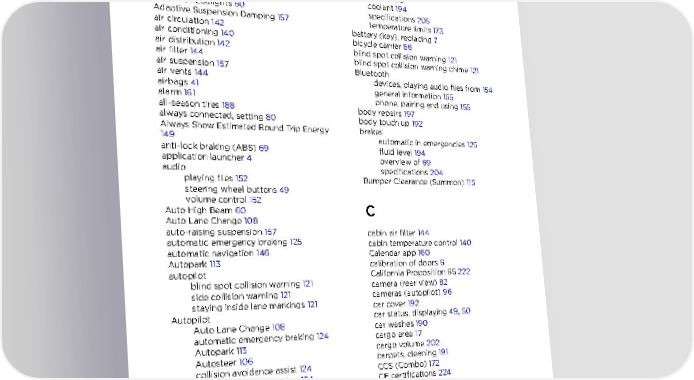 Index Index A B ABS (Anti-lock Braking System) 69 backup camera 82 absolute speed limit 127 battery (12V) Acceleration settings 77 complete discharge 173 access panel, removing 194 specifications 205 accessories Battery (high voltage) plugging into power socket 20 care of 173 accessory carrier 86 coolant 194 adaptive headlights 60 specifications 205 Adaptive Suspension Damping 157 temperature limits 173 air circulation 142 battery (key), replacing 7 air conditioning 140 bicycle carrier 86 air distribution 142 blind spot collision warning 121 air filter 144 blind spot collision warning chime 121 air suspension 157 Bluetooth air vents 144 devices, playing audio files from 154 airbags 41 general information 155 alarm 161 phone, pairing and using 155 all-season tires 188 body repairs 197 always connected, setting 80 body touch up 192 Always Show Estimated Round Trip Energy brakes 149 automatic in emergencies 125 anti-lock braking (ABS) 69 fluid level 194 application launcher 4 overview of 69 audio specifications 204 playing files 152 Bumper Clearance (Summon) 115 steering wheel buttons 49 volume control 152 Auto High Beam 60 C Auto Lane Change 108 auto-raising suspension 157 cabin air filter 144 automatic emergency braking 125 cabin temperature control 140 automatic navigation 146 Calendar app 160 Autopark 113 calibration of doors 6 autopilot California Proposition 65 222 blind spot collision warning 121 camera (rear view) 82 side collision warning 121 cameras (autopilot) 96 staying inside lane markings 121 car cover 192 Autopilot car status, displaying 49, 50 Auto Lane Change 108 car washes 190 automatic emergency braking 124 cargo area 17 Autopark 113 cargo volume 202 Autosteer 106 carpets, cleaning 191 collision avoidance assist 124 CCS (Combo) 172 forward collision warning 124 CE certifications 224 Navigate on Autopilot 109 CHAdeMO 172 overtake acceleration 99 chains 189 overview 96 change of ownership 139 speed assist 127 charge port 175 speed limit warning 127 charge port light 177 staying within speed limits 127 charge port manual release 176 Summon 115 charge port release cable 176 Traffic-Aware Cruise Control 99 charging Autopilot components 96 charge settings 177 Autosteer 106 components and equipment 171 average range 80 instructions 175 public charging stations 172 scheduling 177 Index 227