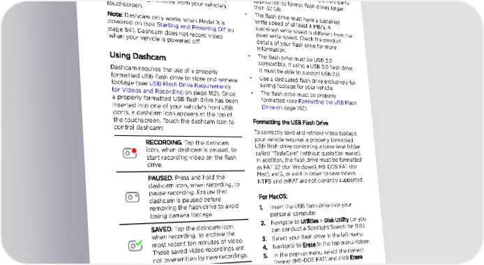 Dashcam Dashcam About Dashcam • Use a flash drive with as much available storage as possible, since video footage Note: Dashcam is a BETA feature. takes up a large amount of space (Tesla In addition to supporting Autopilot features, recommends using a flash drive with at the cameras can record and store video least 32 GB of storage). Some personal footage on a USB flash drive. This can be computer operating systems may not be convenient in situations where you want a able to format flash drives larger than 32 video recording of a particular incident, such GB as FAT 32. Consider using a third party as a collision. You can pause, resume, or save application to format flash drives larger video recordings directly from your vehicle‡s than 32 GB. touchscreen. • The flash drive must have a sustained Note: Dashcam only works when Model X is write speed of at least 4 MB/s. A powered on (see Starting and Powering Off on sustained write speed is different from the page 54). Dashcam does not record video peak write speed. Check the product when your vehicle is powered off. details of your flash drive for more information. • The flash drive must be USB 2.0 Using Dashcam compatible. If using a USB 3.0 flash drive, Dashcam requires the use of a properly it must be able to support USB 2.0. formatted USB flash drive to store and retrieve • Use a dedicated flash drive exclusively for footage (see USB Flash Drive Requirements saving footage for your vehicle. for Videos and Recording on page 162). Once • The flash drive must be properly a properly formatted USB flash drive has been formatted (see Formatting the USB Flash inserted into one of your vehicle's front USB Drive on page 162). ports, a dashcam icon appears at the top of the touchscreen. Touch the dashcam icon to Formatting the USB Flash Drive control dashcam: To correctly save and retrieve video footage, RECORDING. Tap the dashcam your vehicle requires a properly formatted icon, when dashcam is paused, to USB flash drive containing a base-level folder start recording video on the flash called “TeslaCam” (without quotation marks). drive. In addition, the flash drive must be formatted as FAT 32 (for Windows), MS-DOS FAT (for PAUSED. Press and hold the Mac), ext3, or ext4 in order to save videos. dashcam icon, when recording, to NTFS and exFAT are not currently supported. pause recording. Ensure that dashcam is paused before For MacOS: removing the flash drive to avoid 1. Insert the USB flash drive into your losing camera footage. personal computer. SAVED. Tap the dashcam icon, 2. Navigate to Utilities > Disk Utility (or you when recording, to archive the can conduct a Spotlight Search for this). most recent ten minutes of video. 3. Select your flash drive in the left menu. These saved video recordings are 4. Navigate to Erase in the top menu ribbon. not overwritten by new recordings. 5. In the pop-up menu, select the correct format (MS-DOS FAT) and click Erase. Note: Dashcam automatically begins recording Note: Selecting Erase completely erases when you insert a properly configured USB all content on your flash drive. If you have flash drive into one of the front USB ports. other content stored on the flash drive, migrate it to a different device before USB Flash Drive Requirements for erasing it. Videos and Recording 6. Once the flash drive is successfully erased, navigate to Finder and select your USB Flash drives used to store video from your flash drive from the left menu. The flash vehicle's cameras must meet these drive should not contain any files. requirements: 7. Right-click in the empty space of the flash drive and select New Folder. A folder appears in your flash drive space. Driving 83