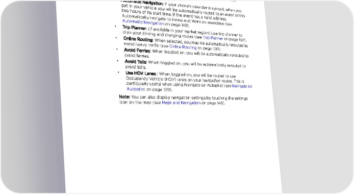 Controls Navigation • Volume Control: Increase or decrease the volume of spoken navigation instructions by touching - or +, respectively. Decreasing all the way to the left mutes the instructions. You can also mute navigation instructions when a navigation route is active by touching the volume icon on the turn-by-turn direction list. Note: The volume setting applies only to the navigation system‡s spoken instructions. Volume for Media Player and Phone remains unchanged. • Automatic Navigation: If your phone's calendar is synced, when you get in your vehicle you will be automatically routed to an event within two hours of its start time, if the event has a valid address. Automatically navigate to Home and Work on weekdays (see Automatic Navigation on page 148). • Trip Planner: (If available in your market region) Use trip planner to plan your driving and charging routes (see Trip Planner on page 150). • Online Routing: When selected, you may be automatically rerouted to avoid heavy traffic (see Online Routing on page 150). • Avoid Ferries: When toggled on, you will be automatically rerouted to avoid ferries. • Avoid Tolls: When toggled on, you will be automatically rerouted to avoid tolls. • Use HOV Lanes : When toggled on, you will be routed to use Occupancy Vehicle (HOV) lanes on your navigation routes. This is particularly useful when using Navigate on Autopilot (see Navigate on Autopilot on page 109). Note: You can also display navigation settings by touching the settings icon on the map (see Maps and Navigation on page 146). 136 Model X Owner's Manual